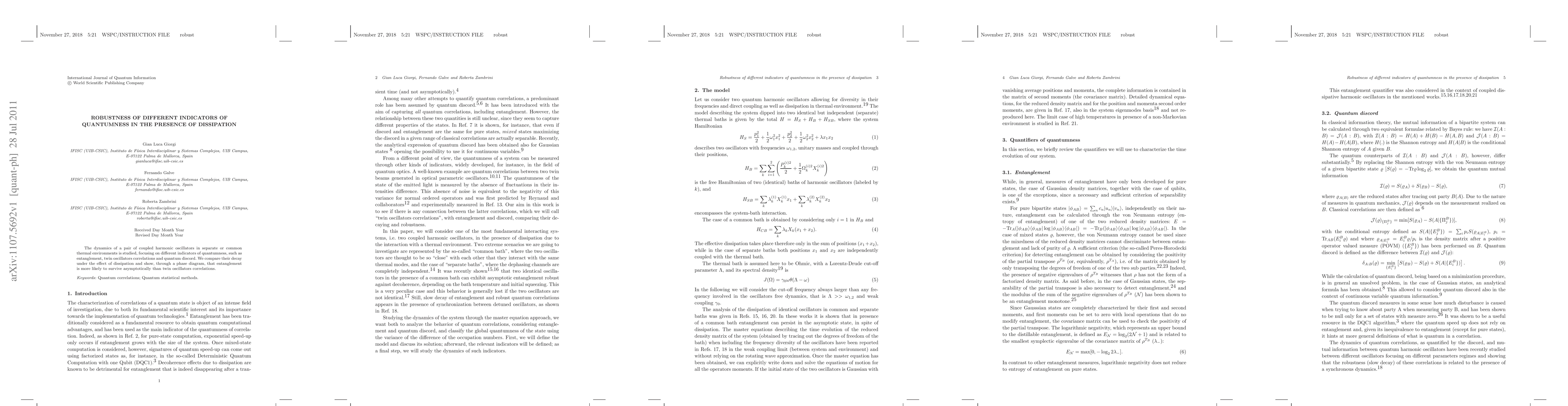 The dynamics of a pair of coupled harmonic oscillators in separate or common thermal environments is studied, focusing on different indicators of quantumness, such as entanglement, twin oscillators correlations and quantum discord. We compare their decay under the effect of dissipation and show, through a phase diagram, that entanglement is more likely to survive asymptotically than twin oscillators correlations.