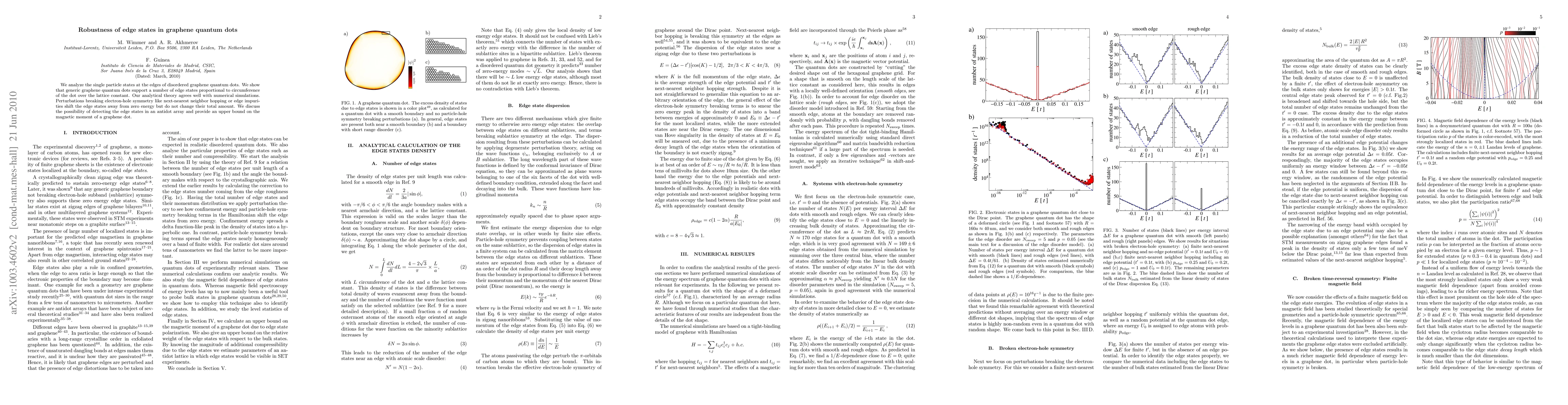 Summary: This study investigates edge states in disordered graphene quantum dots, demonstrating that they are robust and proportional to the dot's circumference over the lattice constant, remaining unaffected by symmetry-breaking perturbations. The research also explores their potential detection in antidot arrays and sets an upper limit on the magnetic moment of graphene dots.