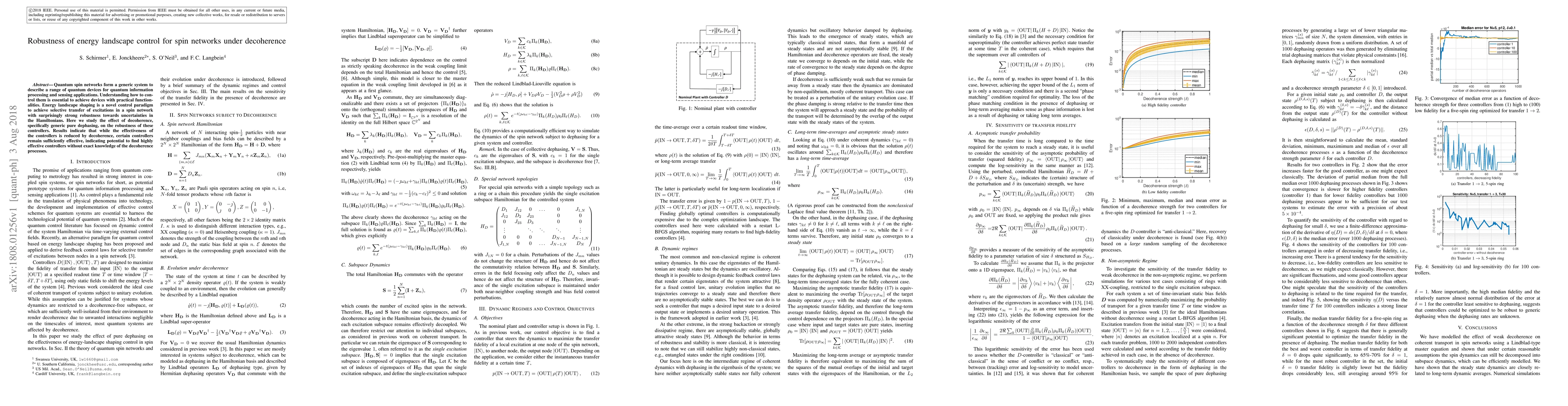 Quantum spin networks form a generic system to describe a range of quantum devices for quantum information processing and sensing applications. Understanding how to control them is essential to achieve devices with practical functionalities. Energy landscape shaping is a novel control paradigm to achieve selective transfer of excitations in a spin network with surprisingly strong robustness towards uncertainties in the Hamiltonians. Here we study the effect of decoherence, specifically generic pure dephasing, on the robustness of these controllers. Results indicate that while the effectiveness of the controllers is reduced by decoherence, certain controllers remain sufficiently effective, indicating potential to find highly effective controllers without exact knowledge of the decoherence processes.