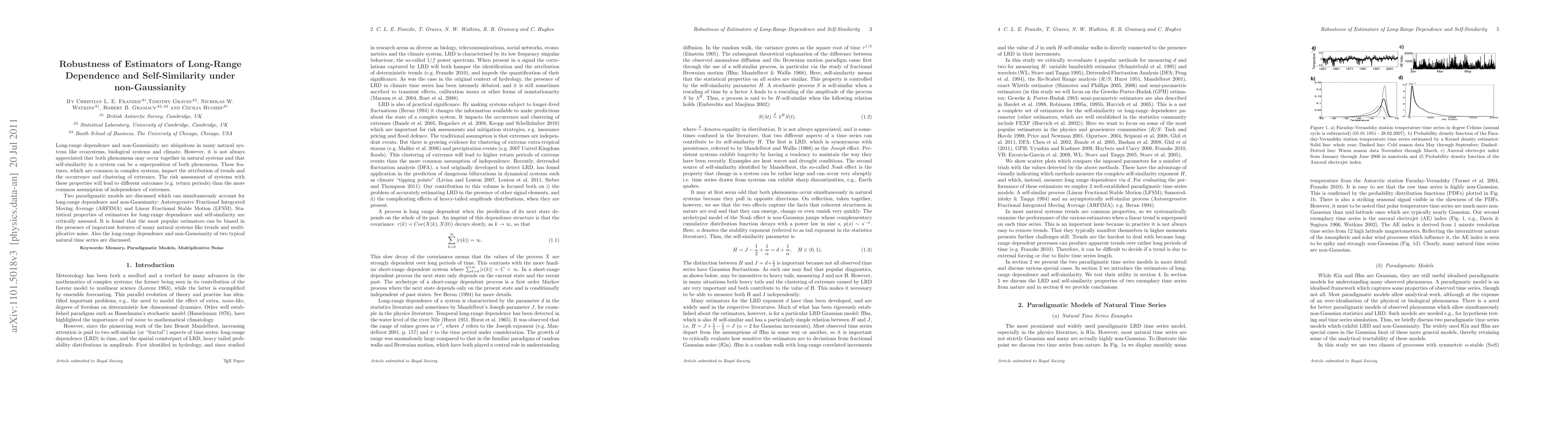 Long-range dependence and non-Gaussianity are ubiquitous in many natural systems like ecosystems, biological systems and climate. However, it is not always appreciated that both phenomena may occur together in natural systems and that self-similarity in a system can be a superposition of both phenomena. These features, which are common in complex systems, impact the attribution of trends and the occurrence and clustering of extremes. The risk assessment of systems with these properties will lead to different outcomes (e.g. return periods) than the more common assumption of independence of extremes. Two paradigmatic models are discussed which can simultaneously account for long-range dependence and non-Gaussianity: Autoregressive Fractional Integrated Moving Average (ARFIMA) and Linear Fractional Stable Motion (LFSM). Statistical properties of estimators for long-range dependence and self-similarity are critically assessed. It is found that the most popular estimators can be biased in the presence of important features of many natural systems like trends and multiplicative noise. Also the long-range dependence and non-Gaussianity of two typical natural time series are discussed.