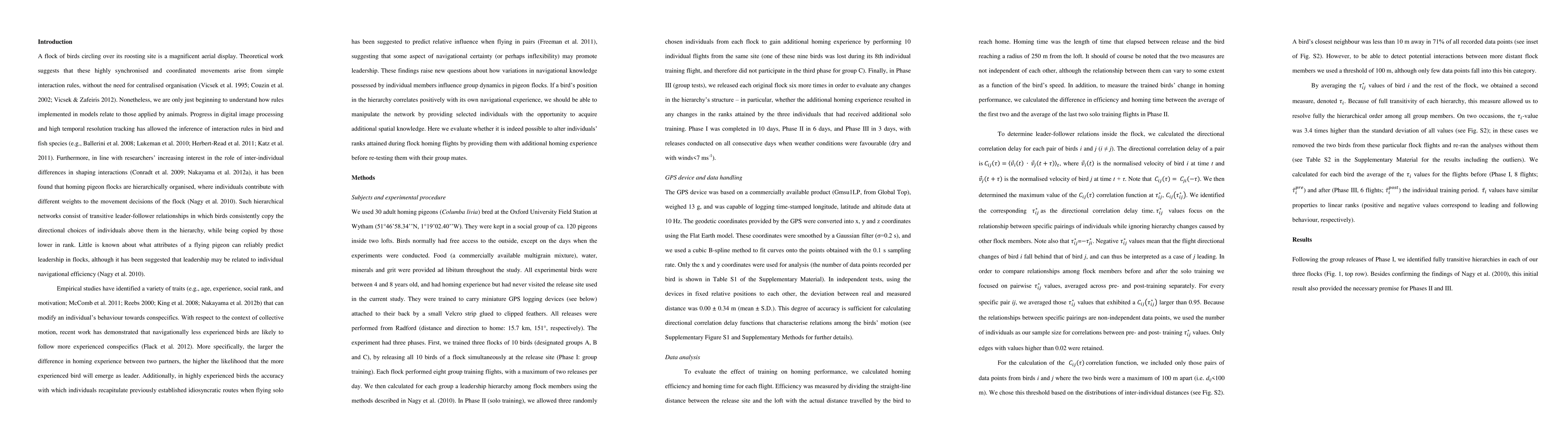 Collective animal movements produce spectacular natural phenomena that arise from simple local interactions among group members. Flocks of homing pigeons, Columba livia, provide a useful model for the study of collective motion and decision making. During homing flights, flock members are forced to resolve potentially divergent navigational preferences in order to stay together and benefit from flying in a group. Recent work has demonstrated that some individuals consistently contribute more to the movement decisions of the flock than others do, thereby generating stable hierarchical leader/follower networks. Yet, what attributes of a flying pigeon reliably predict leadership remains an open question. We examined the flexibility of an individual's hierarchical leadership rank (i.e. its ordinal position when flock members are ranked according to the average time differences with which they lead or follow others) as a function of changes in its navigational knowledge. We manipulated already established hierarchical networks in three different flocks, by providing certain individuals with additional homing experience. We found that such training did not consistently lead to an increase in birds' leadership ranks, and that, in general, the nature of leader/follower interactions between trained and untrained birds remained unaffected. Thus, leadership hierarchies in pigeon flocks appear resistant to changes in the navigational knowledge of a subset of their members, at least when these changes are relatively small. We discuss the implications of our results in light of the potential benefits of structural stability in decision-making networks.