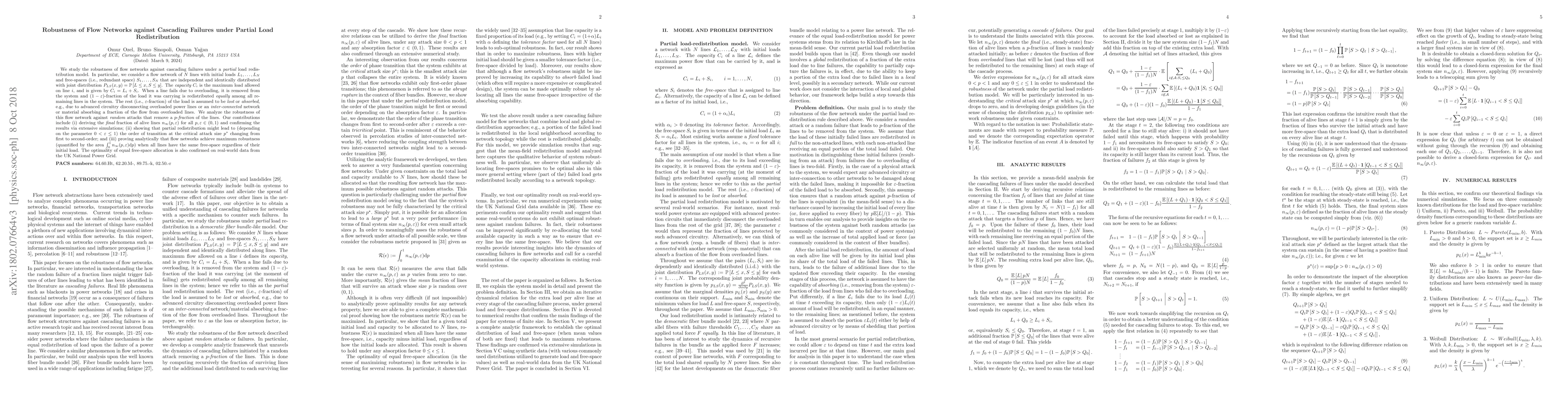 This paper investigates the robustness of flow networks against cascading failures under a partial load redistribution model, analyzing the impact of random attacks on the network. It finds that equal allocation of free-space among lines maximizes robustness, and the transition order at the critical attack size can change depending on the redistribution fraction.