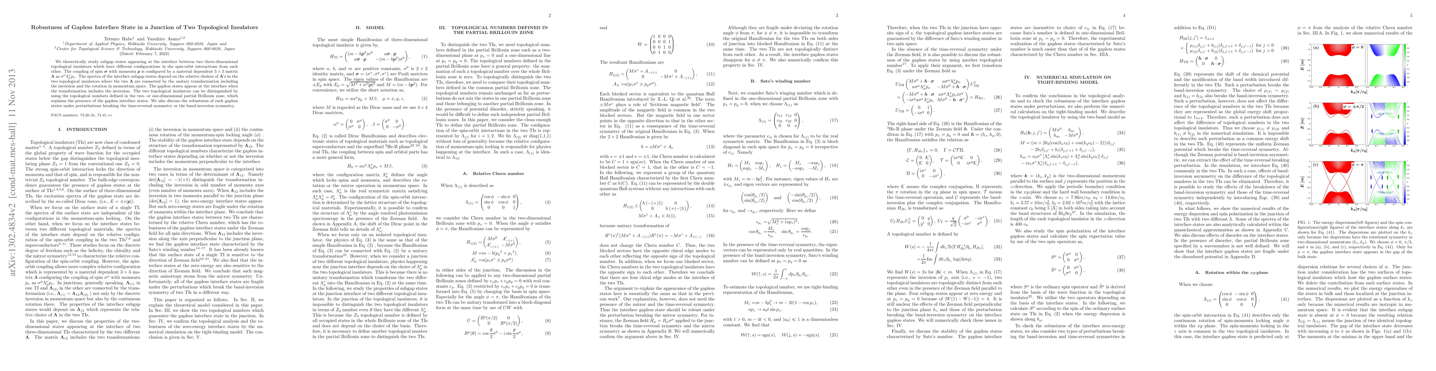 This paper investigates subgap states at the interface between two topological insulators with different spin-orbit coupling configurations, showing that gapless interface states are robust against perturbations that break time-reversal or band-inversion symmetries. The study uses a material-dependent matrix to describe spin-momentum coupling and employs numerical simulations to analyze the robustness of these states.