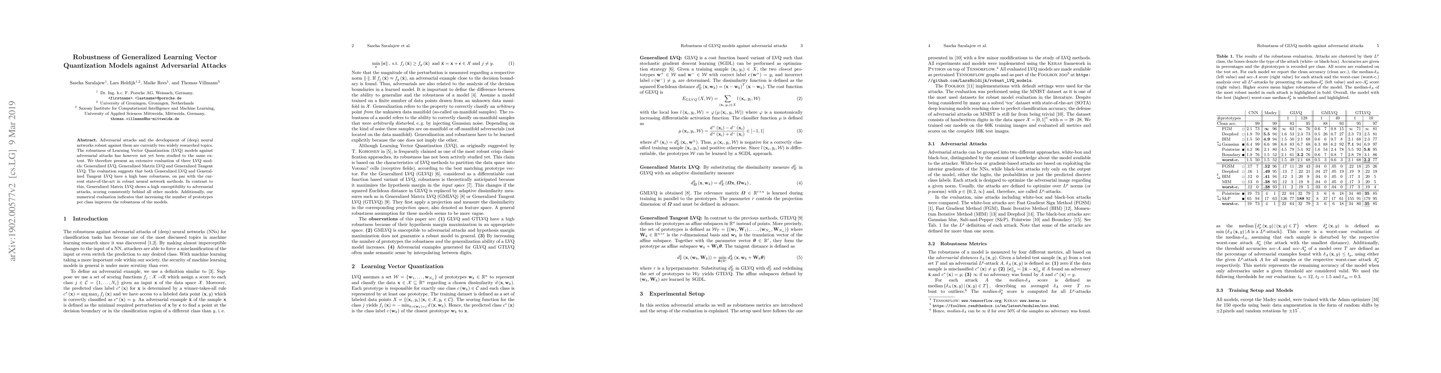 This paper evaluates the robustness of three Generalized Learning Vector Quantization (LVQ) models against adversarial attacks, finding that Generalized LVQ and Generalized Tangent LVQ exhibit high base robustness comparable to state-of-the-art neural network methods, while Generalized Matrix LVQ is notably less robust. Increasing the number of prototypes per class enhances model robustness.