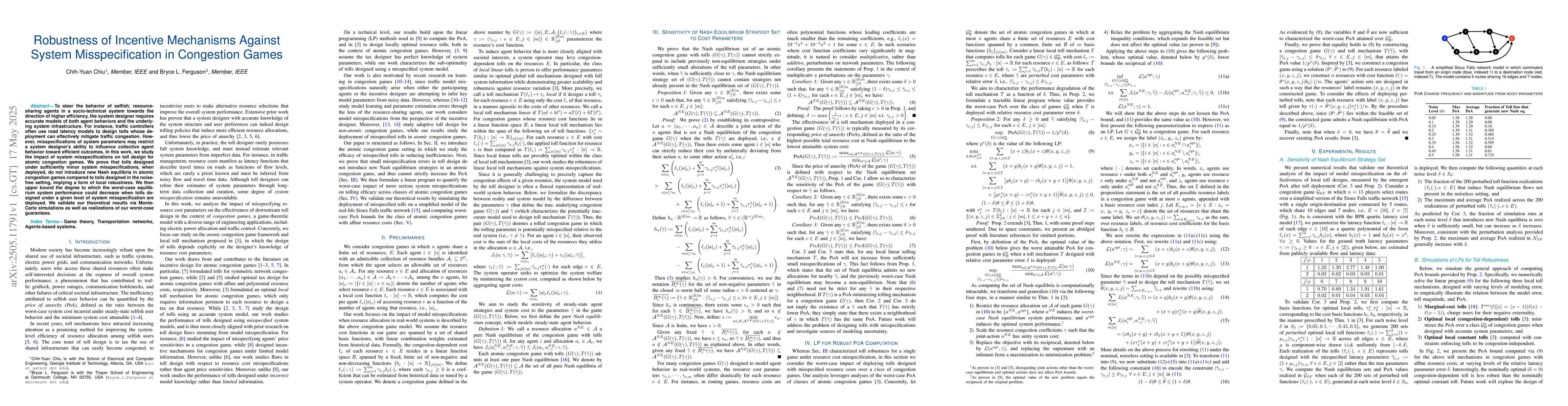 The paper presents theoretical proofs and bounds on the performance degradation of tolls under system misspecifications, along with simulation and real-world validation.