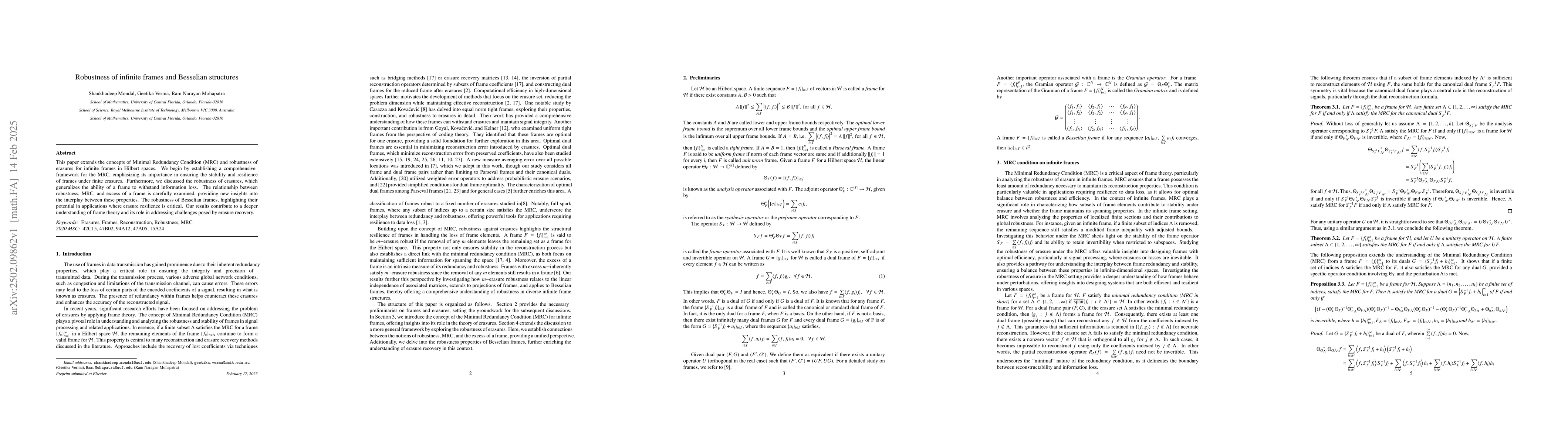 The paper establishes a framework for the Minimal Redundancy Condition (MRC) in infinite frames of Hilbert spaces, examining robustness of erasures and its relationship with MRC and frame excess.