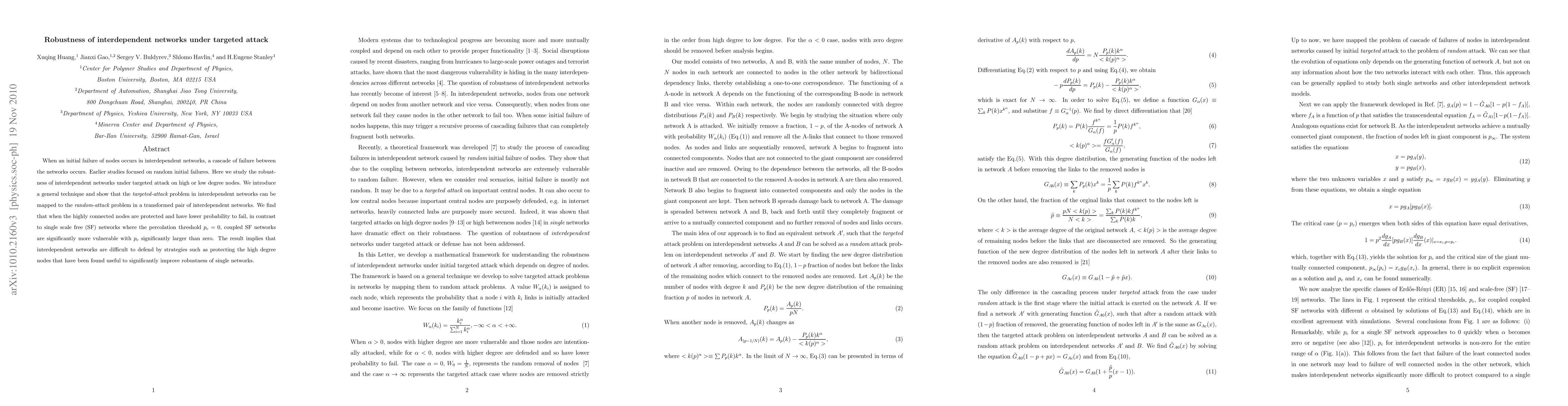 This paper investigates the robustness of interdependent networks under targeted attacks, demonstrating that protecting high-degree nodes does not enhance resilience as it does in single networks. It shows that coupled scale-free networks remain vulnerable even when highly connected nodes are safeguarded, contrasting with the improved robustness seen in single networks.