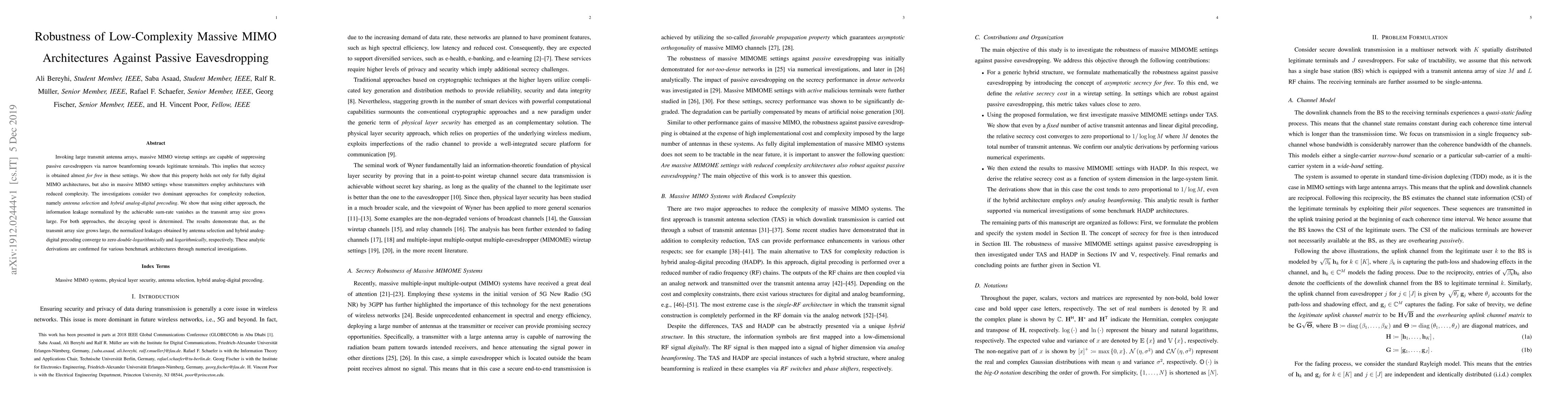 Invoking large transmit antenna arrays, massive MIMO wiretap settings are capable of suppressing passive eavesdroppers via narrow beamforming towards legitimate terminals. This implies that secrecy is obtained almost for free in these settings. We show that this property holds not only for fully digital MIMO architectures, but also in massive MIMO settings whose transmitters employ architectures with reduced complexity. The investigations consider two dominant approaches for complexity reduction, namely antenna selection and hybrid analog-digital precoding. We show that using either approach, the information leakage normalized by the achievable sum-rate vanishes as the transmit array size grows large. For both approaches, the decaying speed is determined. The results demonstrate that, as the transmit array size grows large, the normalized leakages obtained by antenna selection and hybrid analog-digital precoding converge to zero double-logarithmically and logarithmically, respectively. These analytic derivations are confirmed for various benchmark architectures through numerical investigations.