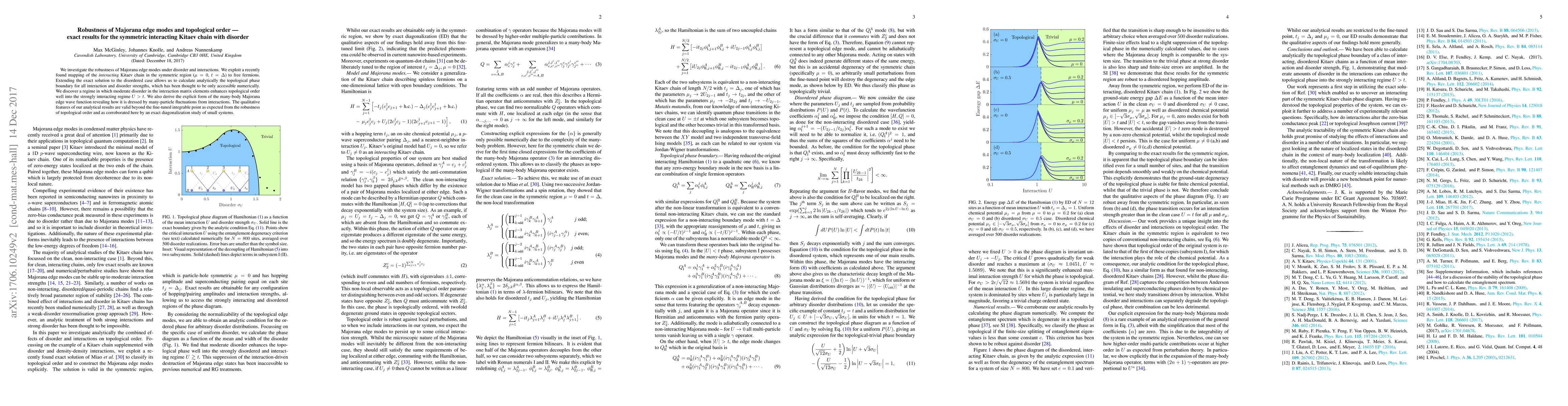 We investigate the robustness of Majorana edge modes under disorder and interactions. We exploit a recently found mapping of the interacting Kitaev chain in the symmetric region ($\mu = 0$, $t = \Delta$) to free fermions. Extending the exact solution to the disordered case allows us to calculate analytically the topological phase boundary for all interaction and disorder strengths, which has been thought to be only accessible numerically. We discover a regime in which moderate disorder in the interaction matrix elements enhances topological order well into the strongly interacting regime $U > t$. We also derive the explicit form of the many-body Majorana edge wave function revealing how it is dressed by many-particle fluctuations from interactions. The qualitative features of our analytical results are valid beyond the fine-tuned integrable point as expected from the robustness of topological order and as corroborated here by an exact diagonalization study of small systems.