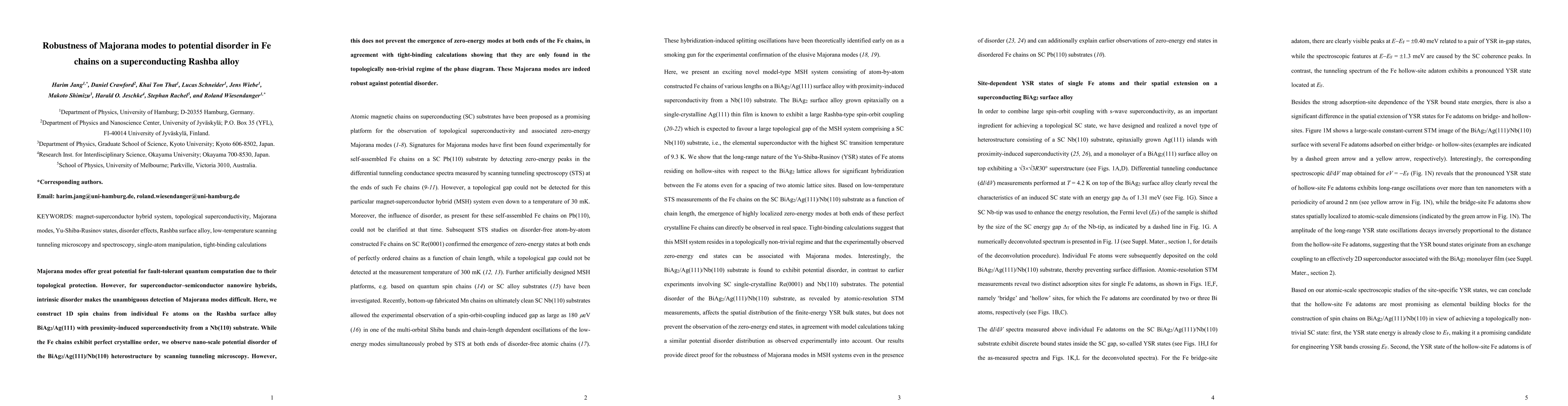 This research demonstrates that Majorana modes, crucial for fault-tolerant quantum computation, remain stable even in the presence of potential disorder. By constructing 1D iron (Fe) chains on a superconducting Rashba alloy BiAg2/Ag(111) with proximity-induced superconductivity from a Nb(110) substrate, the study confirms the emergence of zero-energy modes at both ends of the Fe chains, showcasing their robustness against nano-scale disorder.