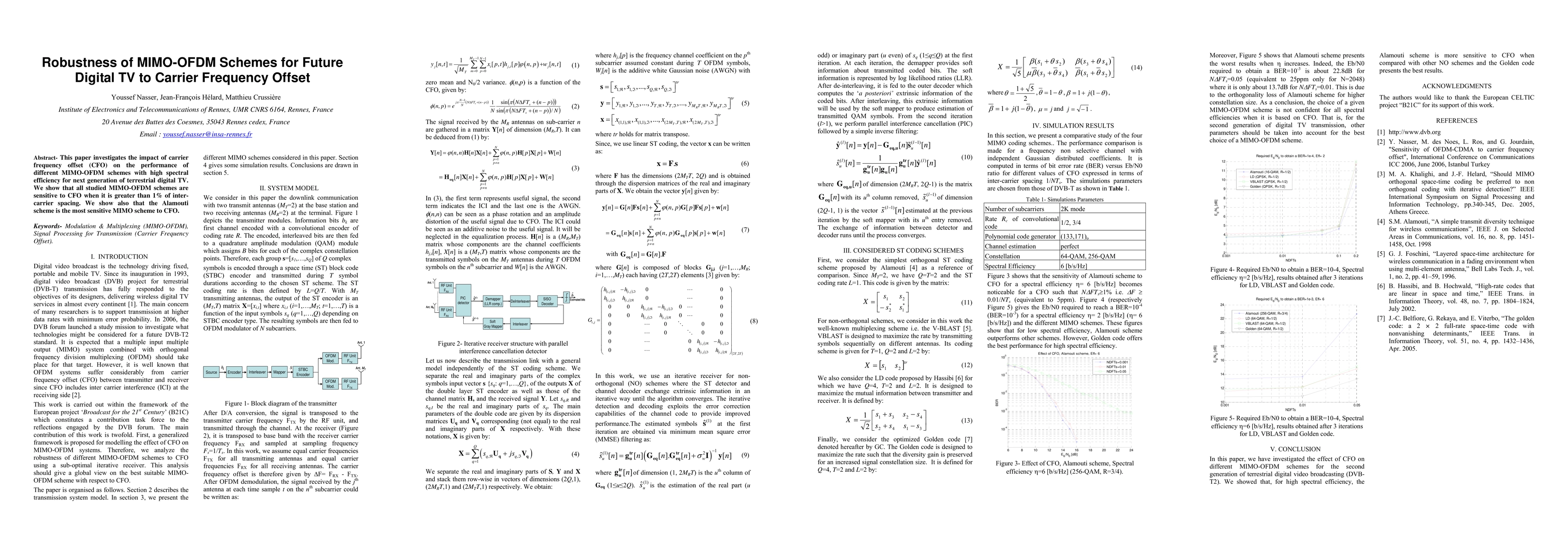 This paper examines the effect of carrier frequency offset (CFO) on various high spectral efficiency MIMO-OFDM schemes for future digital TV, revealing that all schemes are sensitive to CFO above 1% of inter-carrier spacing, with the Alamouti scheme being the most affected.