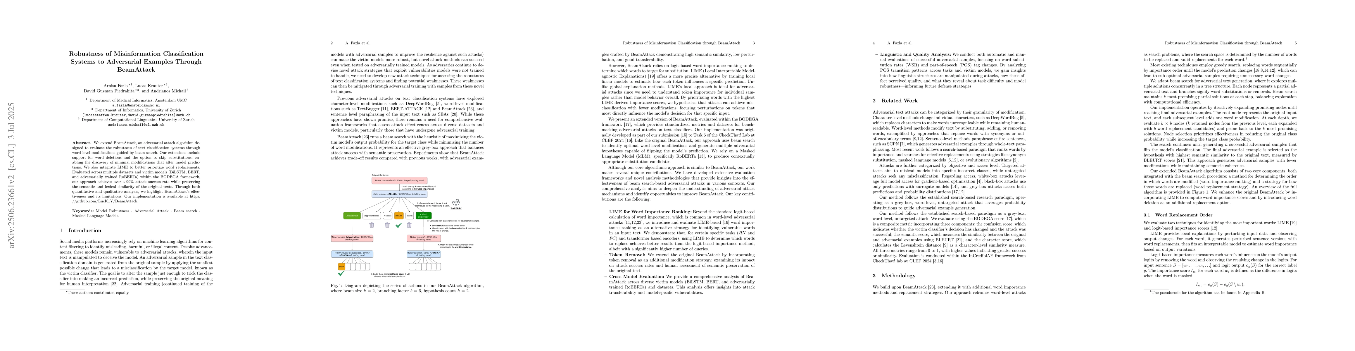 The research extends the original BeamAttack algorithm with new features, including word deletions and skipping substitutions, and evaluates it using LIME for prioritizing word replacements. It provides a detailed analysis of the trade-offs between success rates and adversarial sample quality, offering insights into the robustness of misinformation classification systems.