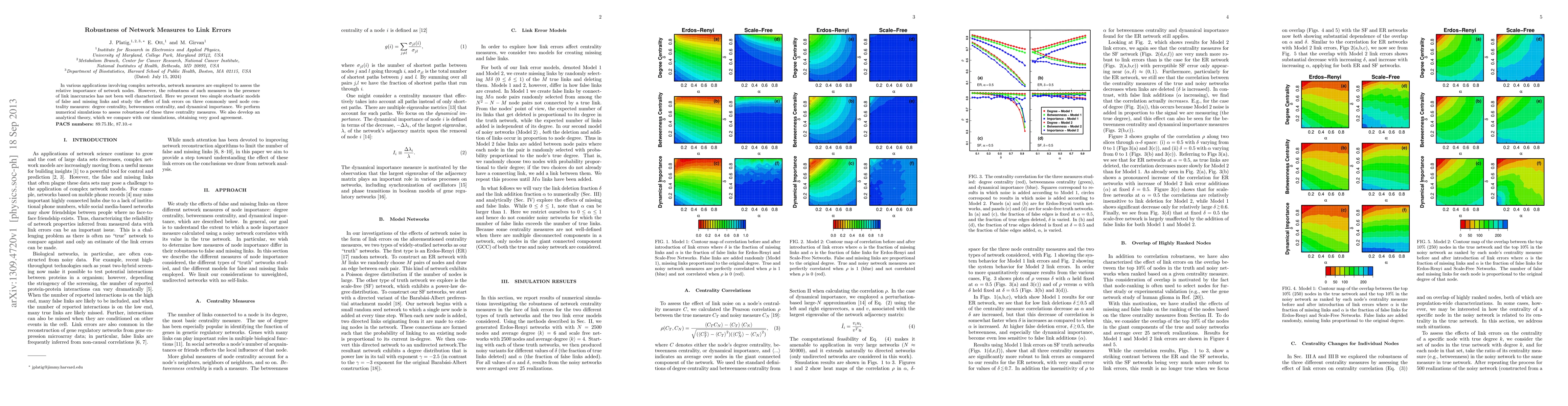 This paper investigates the robustness of three node centrality measures—degree centrality, betweenness centrality, and dynamical importance—against link errors in complex networks. Through both numerical simulations and analytical theory, it finds that the measures exhibit varying degrees of sensitivity to false and missing links.
