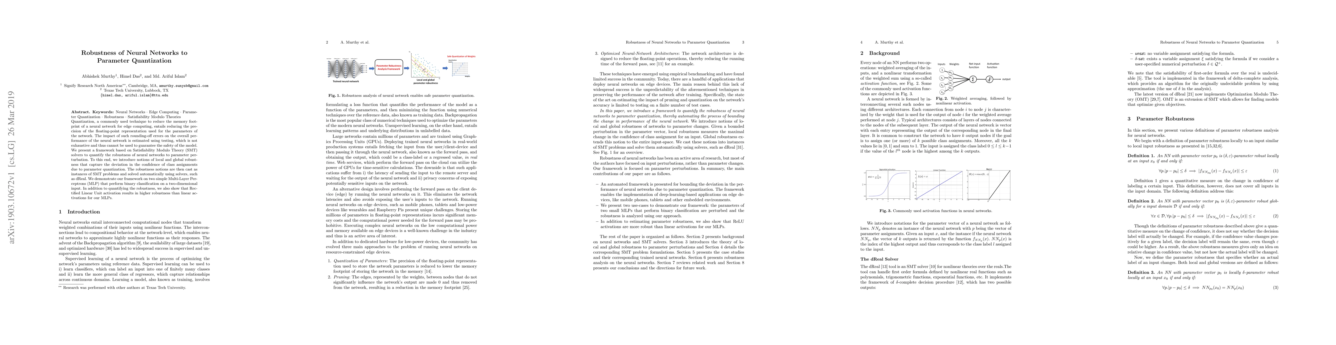 Quantization, a commonly used technique to reduce the memory footprint of a neural network for edge computing, entails reducing the precision of the floating-point representation used for the parameters of the network. The impact of such rounding-off errors on the overall performance of the neural network is estimated using testing, which is not exhaustive and thus cannot be used to guarantee the safety of the model. We present a framework based on Satisfiability Modulo Theory (SMT) solvers to quantify the robustness of neural networks to parameter perturbation. To this end, we introduce notions of local and global robustness that capture the deviation in the confidence of class assignments due to parameter quantization. The robustness notions are then cast as instances of SMT problems and solved automatically using solvers, such as dReal. We demonstrate our framework on two simple Multi-Layer Perceptrons (MLP) that perform binary classification on a two-dimensional input. In addition to quantifying the robustness, we also show that Rectified Linear Unit activation results in higher robustness than linear activations for our MLPs.