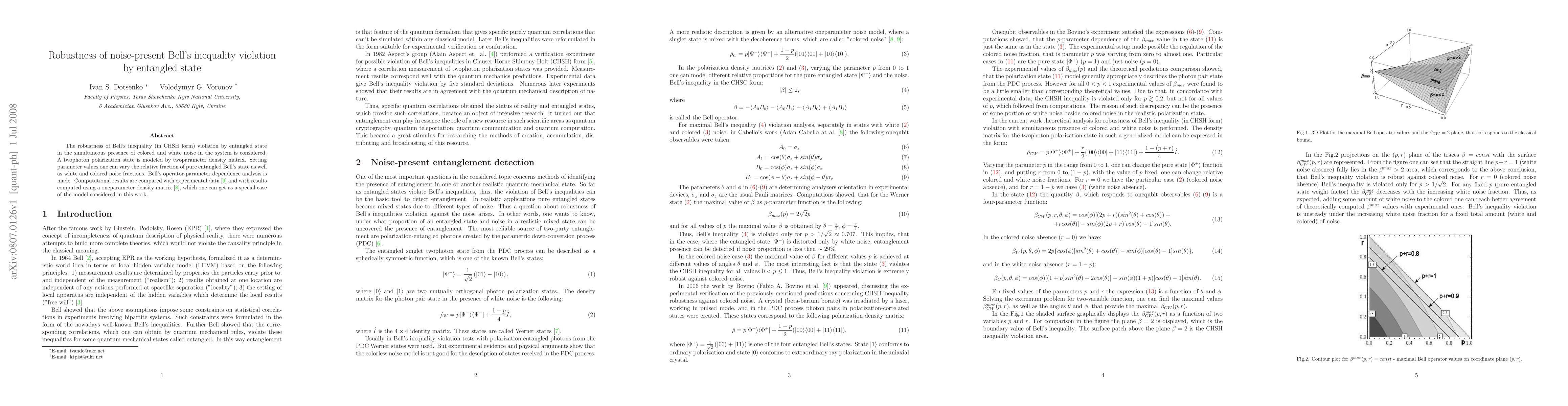 The robustness of Bell's inequality (in CHSH form) violation by entangled state in the simultaneous presence of colored and white noise in the system is considered. A twophoton polarization state is modeled by twoparameter density matrix. Setting parameter values one can vary the relative fraction of pure entangled Bell's state as well as white and colored noise fractions. Bell's operator-parameter dependence analysis is made. Computational results are compared with experimental data [quant-ph/0511265] and with results computed using a oneparameter density matrix [doi: 10.1103/PhysRevA.72.052112], which one can get as a special case of the model considered in this work.