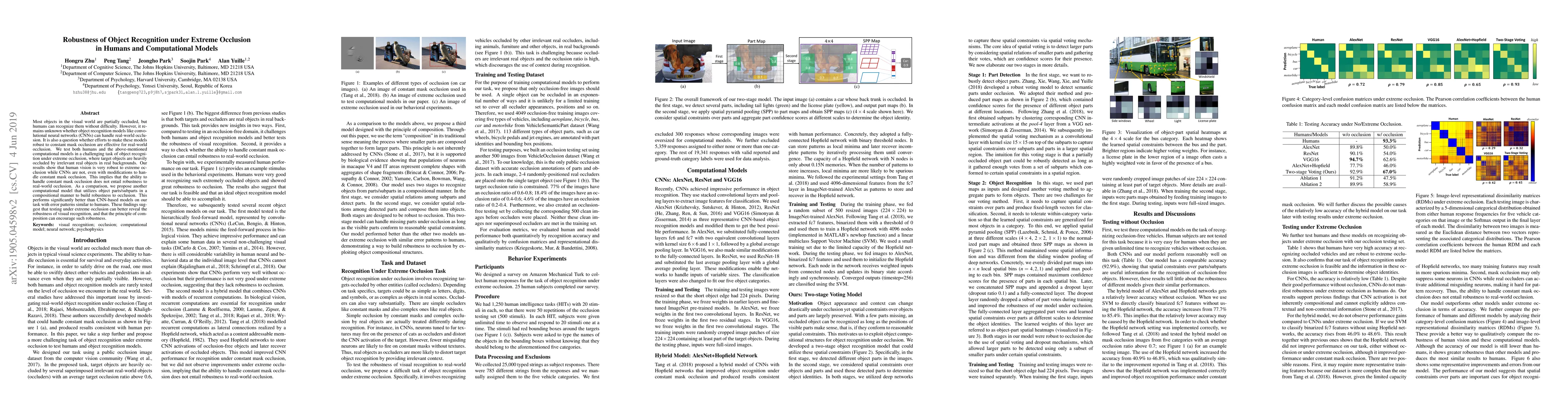 This research investigates the ability of human vision and computational models, specifically convolutional neural networks (CNNs), to recognize objects under extreme occlusion. The study finds that while humans excel in this task, CNNs struggle, even with modifications designed for constant mask occlusion. The paper proposes an alternative computational model based on object parts, which performs better and aligns more closely with human error patterns, suggesting that the principle of composition can enhance robustness to real-world occlusion.