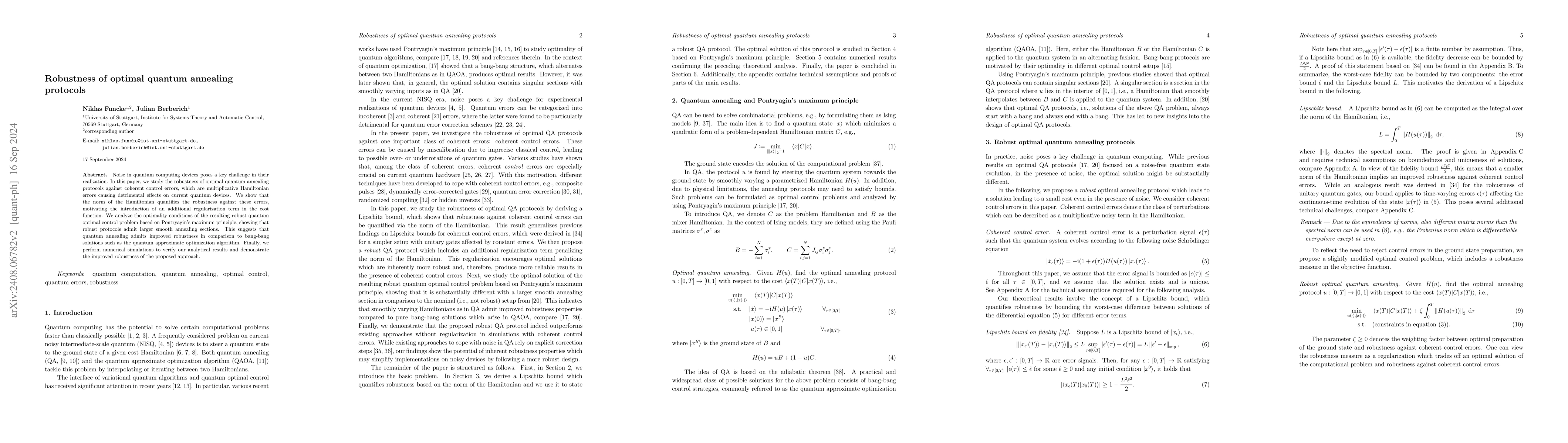 This paper investigates the robustness of optimal quantum annealing protocols against coherent control errors, finding that the Hamiltonian norm measures this robustness. It proposes a regularization term in the cost function to enhance robustness, demonstrating via Pontryagin's maximum principle that robust protocols allow for longer smooth annealing sections, thus showing improved robustness compared to traditional bang-bang solutions, as verified by numerical simulations.