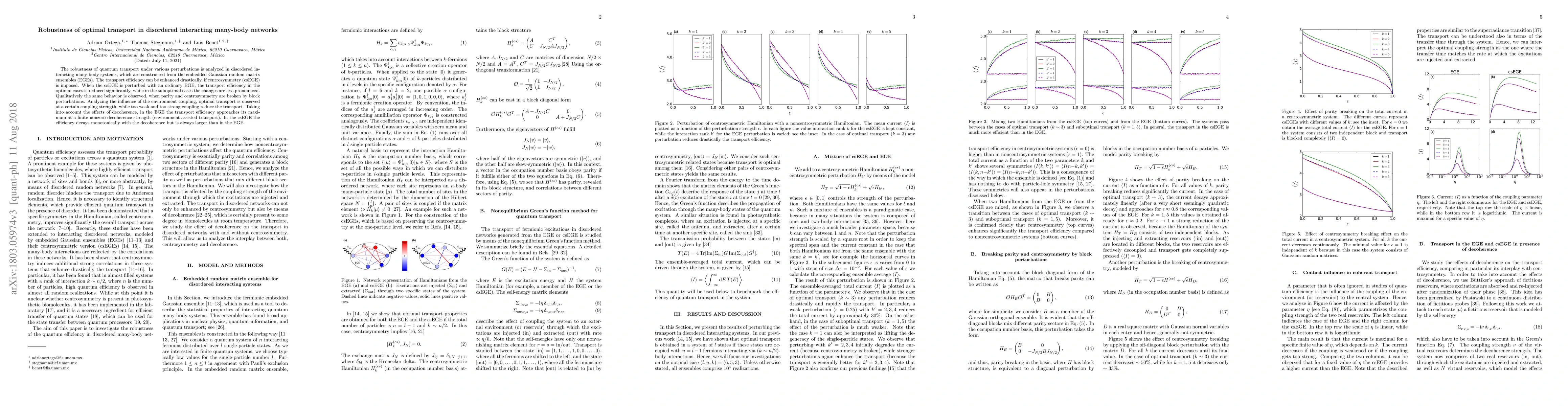 The robustness of quantum transport under various perturbations is analyzed in disordered interacting many-body systems, which are constructed from the embedded Gaussian random matrix ensembles (EGEs). The transport efficiency can be enhanced drastically, if centrosymmetry (csEGE) is imposed. When the csEGE is perturbed with an ordinary EGE, the transport efficiency in the optimal cases is reduced significantly, while in the suboptimal cases the changes are less pronounced. Qualitatively the same behavior is observed, when parity and centrosymmetry are broken by block perturbations. Analyzing the influence of the environment coupling, optimal transport is observed at a certain coupling strength, while too weak and too strong coupling reduce the transport. Taking into account the effects of decoherence, in the EGE the transport efficiency approaches its maximum at a finite nonzero decoherence strength (environment-assisted transport). In the csEGE the efficiency decays monotonically with the decoherence but is always larger than in the EGE.