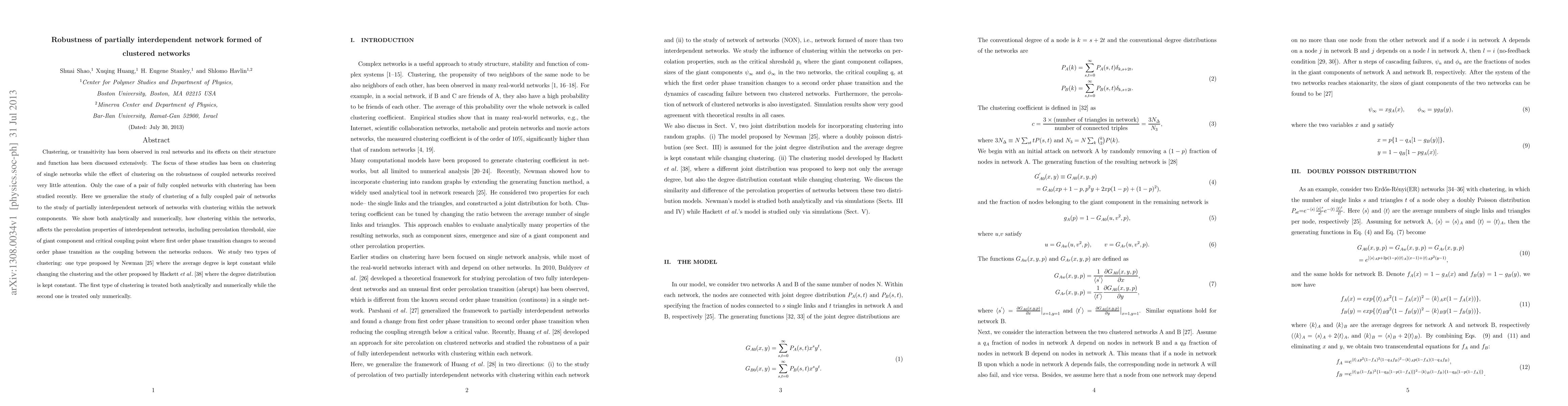 This paper investigates how clustering within individual networks affects the robustness of partially interdependent networks. It analytically and numerically demonstrates the impact of clustering on percolation properties, including threshold, giant component size, and critical coupling points, under two clustering models.