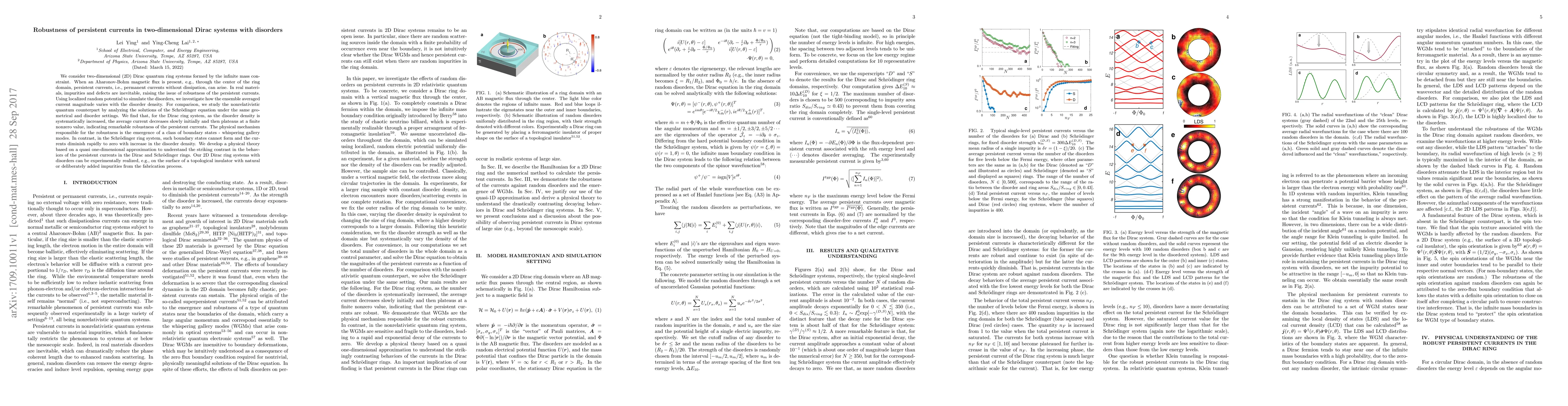 The study investigates the robustness of persistent currents in two-dimensional Dirac systems with disorders by using a localized random potential to simulate disorders. It compares the Dirac ring system with its nonrelativistic quantum counterpart, analyzing the Schrödinger equation under similar geometrical and disorder settings.