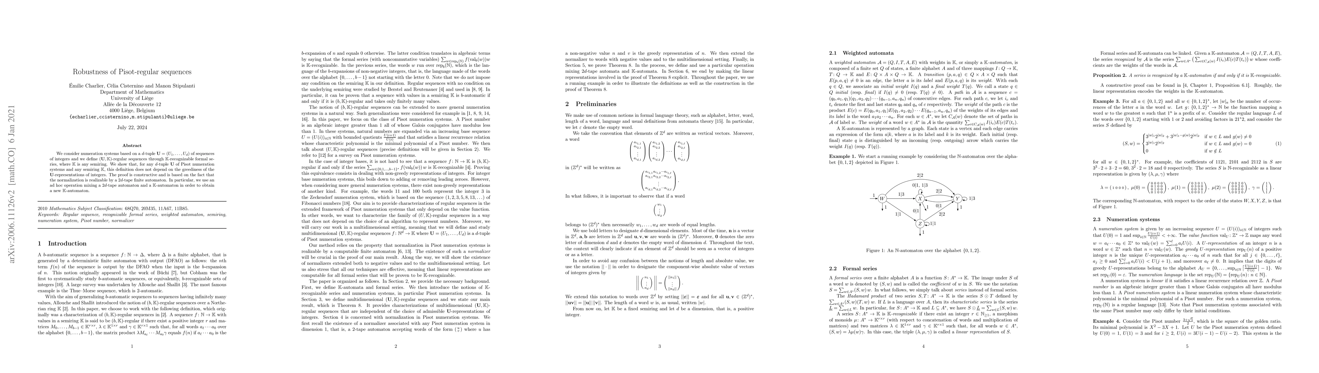 We consider numeration systems based on a $d$-tuple $\mathbf{U}=(U_1,\ldots,U_d)$ of sequences of integers and we define $(\mathbf{U},\mathbb{K})$-regular sequences through $\mathbb{K}$-recognizable formal series, where $\mathbb{K}$ is any semiring. We show that, for any $d$-tuple $\mathbf{U}$ of Pisot numeration systems and any commutative semiring $\mathbb{K}$, this definition does not depend on the greediness of the $\mathbf{U}$-representations of integers. The proof is constructive and is based on the fact that the normalization is realizable by a $2d$-tape finite automaton. In particular, we use an ad hoc operation mixing a $2d$-tape automaton and a $\mathbb{K}$-automaton in order to obtain a new $\mathbb{K}$-automaton.