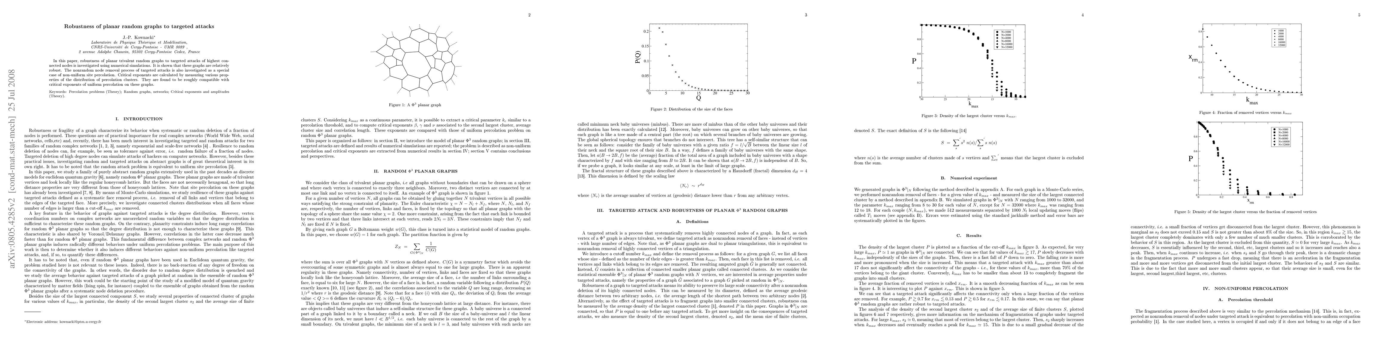This paper investigates the robustness of planar trivalent random graphs against targeted attacks on the highest connected nodes, revealing their relative resilience. The study also examines nonrandom node removal as a form of non-uniform site percolation, finding critical exponents comparable to those of uniform percolation.