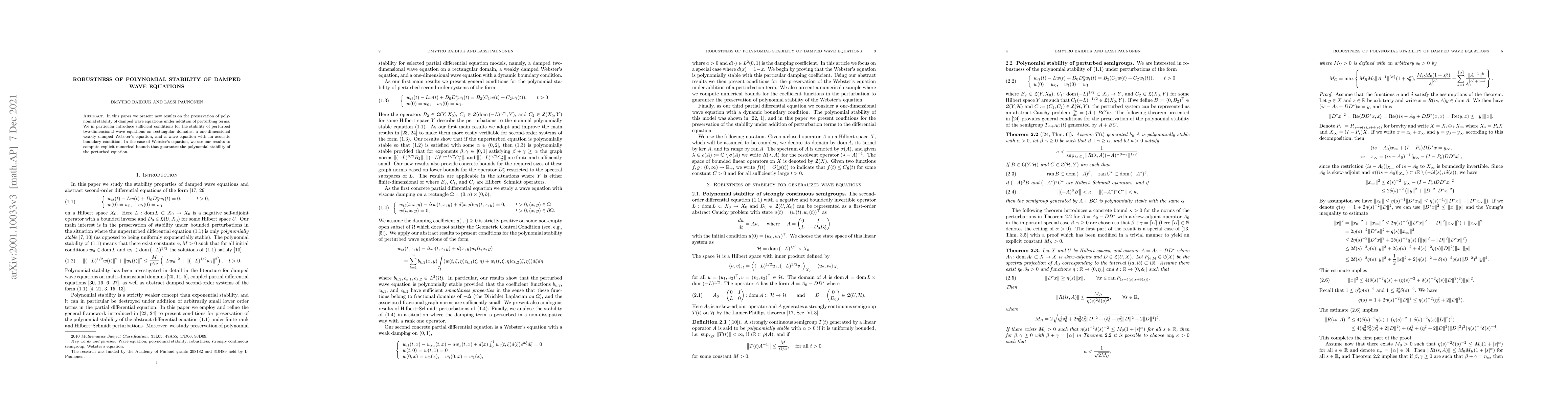 This paper investigates the robustness of polynomial stability in damped wave equations under perturbations, providing sufficient conditions for stability in various forms, including 2D wave equations, 1D weakly damped Webster's equation, and a wave equation with acoustic boundary conditions, with explicit numerical bounds for Webster's equation.