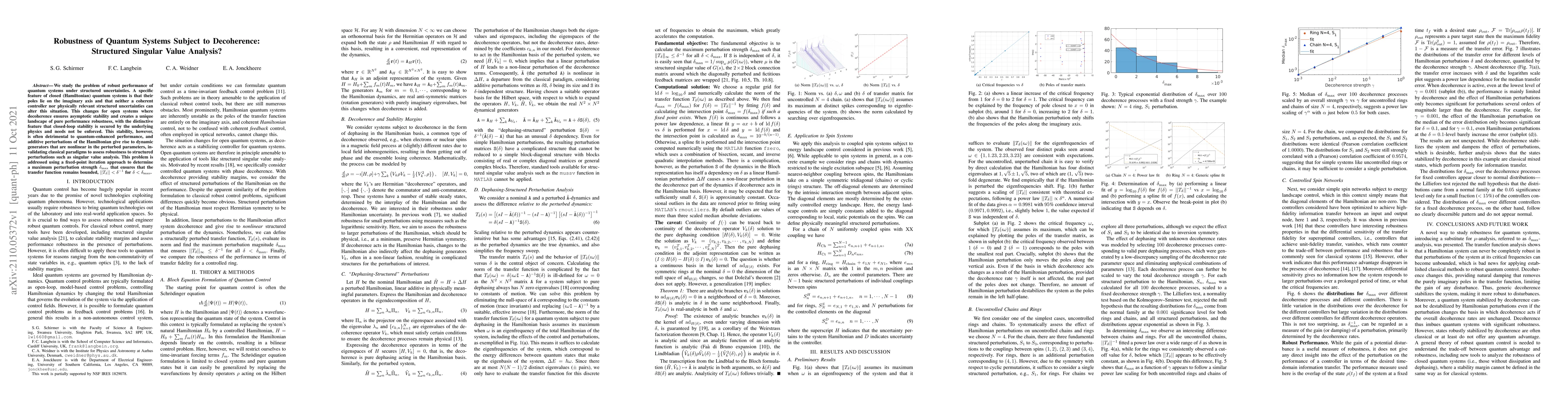 This paper investigates the robustness of quantum systems facing decoherence, focusing on open systems where decoherence provides asymptotic stability. It proposes a fixed-point iteration method to determine the maximum perturbation strength that maintains bounded transfer functions, challenging classical singular value analysis for structured uncertainties.