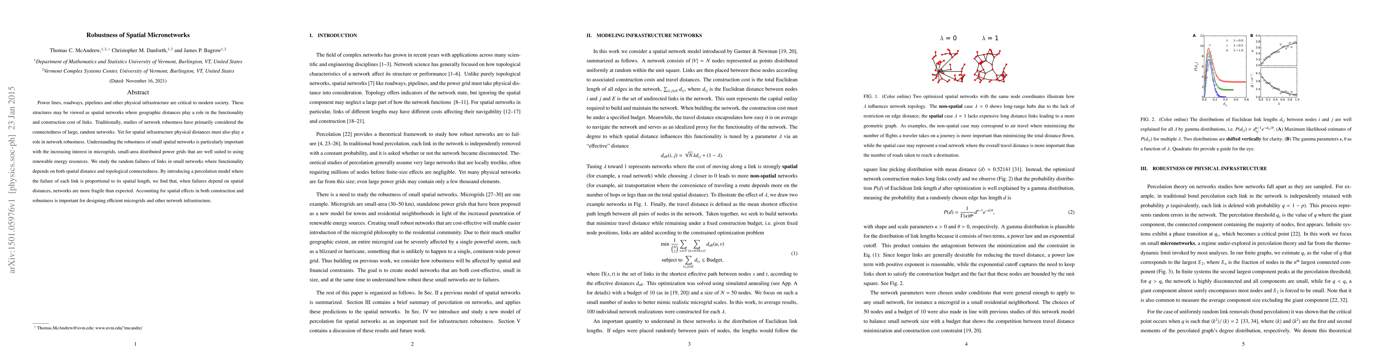This paper investigates the robustness of small spatial networks, such as microgrids, under random link failures where failure probability is proportional to spatial length. It finds that spatial distance significantly increases network fragility, emphasizing the importance of spatial considerations in designing resilient infrastructure.