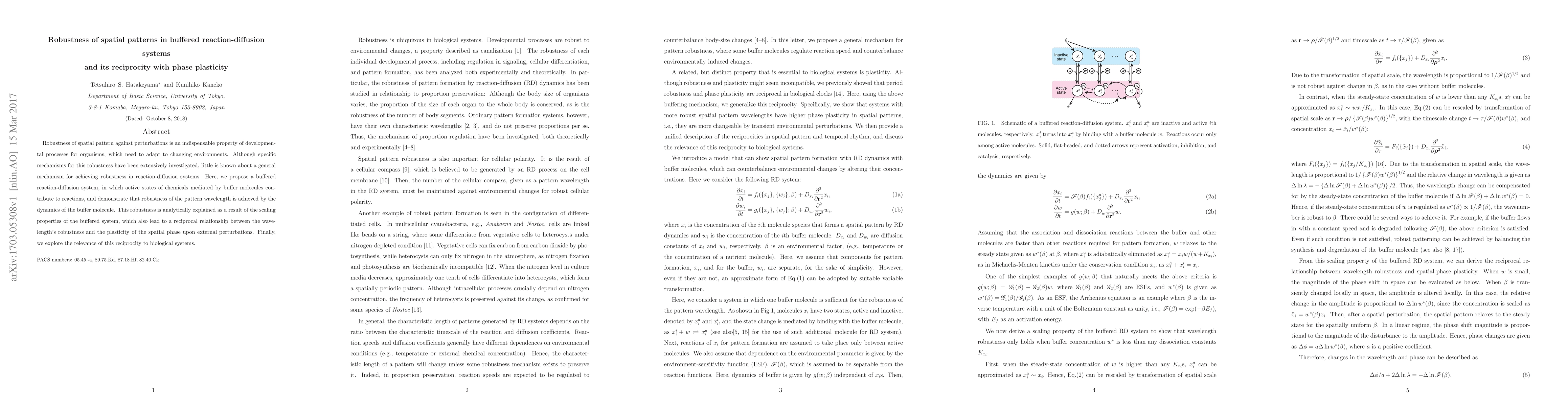 This paper proposes a buffered reaction-diffusion system where buffer molecules enhance robustness of spatial patterns against perturbations. It demonstrates that the pattern wavelength's robustness arises from the buffer molecule's dynamics and reveals a reciprocal relationship between this robustness and spatial phase plasticity.
