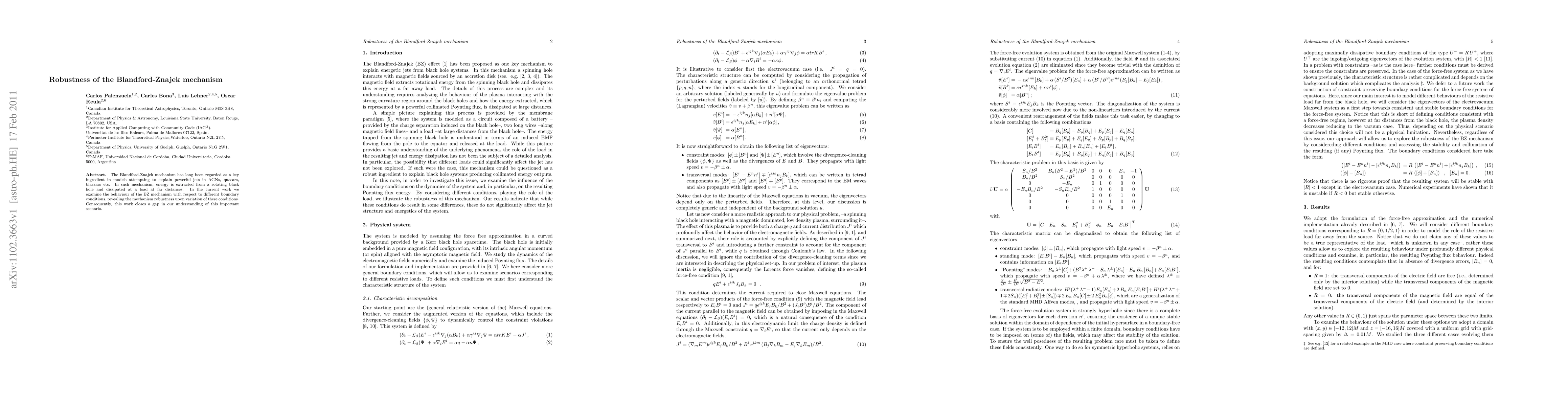 The Blandford-Znajek mechanism has long been regarded as a key ingredient in models attempting to explain powerful jets in AGNs, quasars, blazzars etc. In such mechanism, energy is extracted from a rotating black hole and dissipated at a load at far distances. In the current work we examine the behaviour of the BZ mechanism with respect to different boundary conditions, revealing the mechanism robustness upon variation of these conditions. Consequently, this work closes a gap in our understanding of this important scenario.