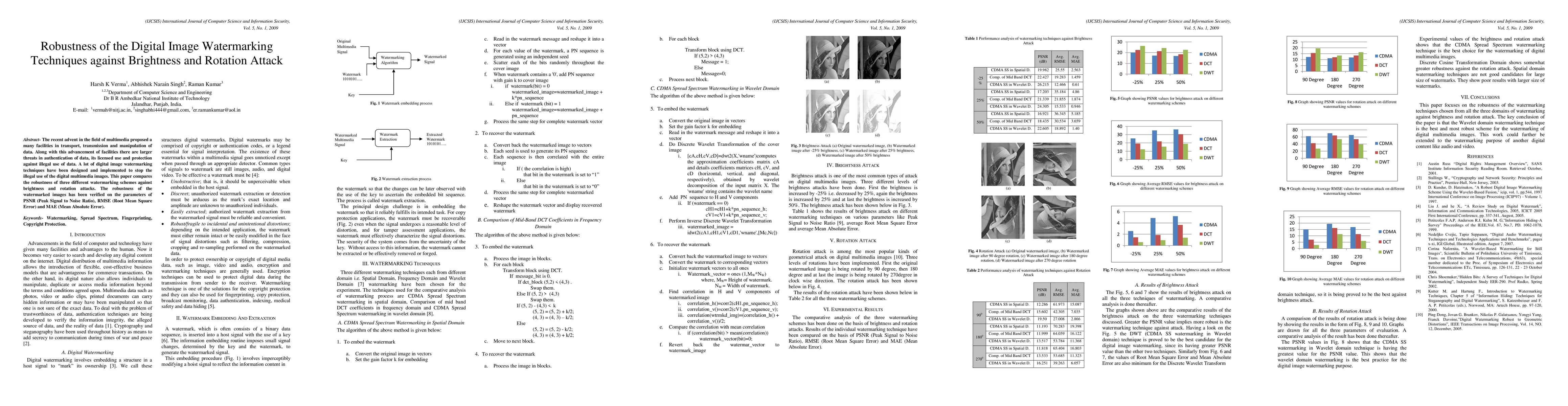 This paper evaluates the robustness of three digital image watermarking techniques against brightness and rotation attacks, using metrics like PSNR, RMSE, and MAE to assess their security.