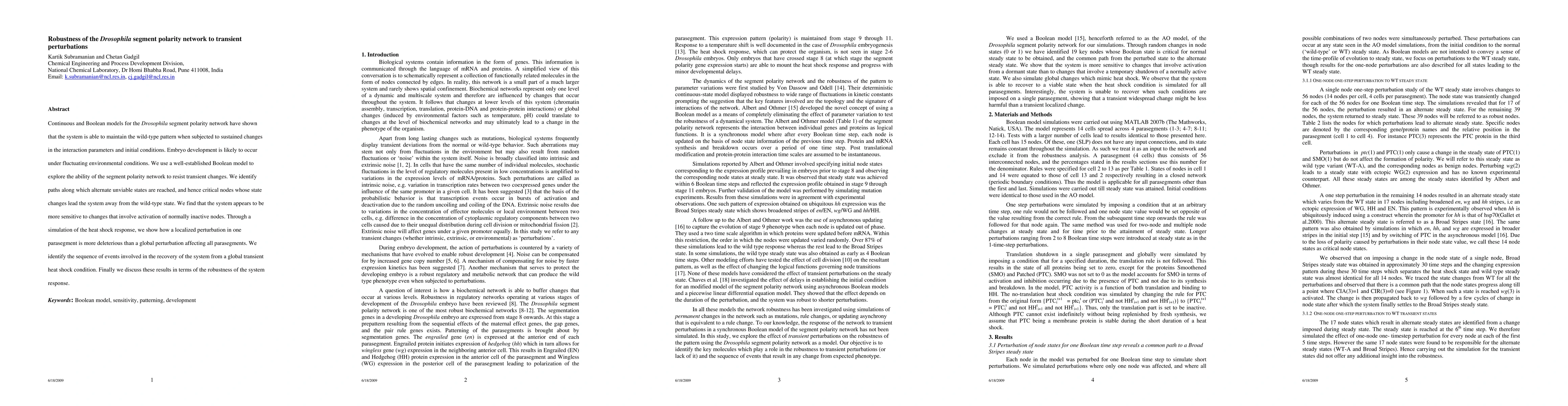 This paper investigates the robustness of the Drosophila segment polarity network to transient perturbations using a Boolean model, finding that the system is more sensitive to activation of normally inactive nodes. It highlights the differential impact of localized versus global perturbations and outlines recovery mechanisms following global transient stress.
