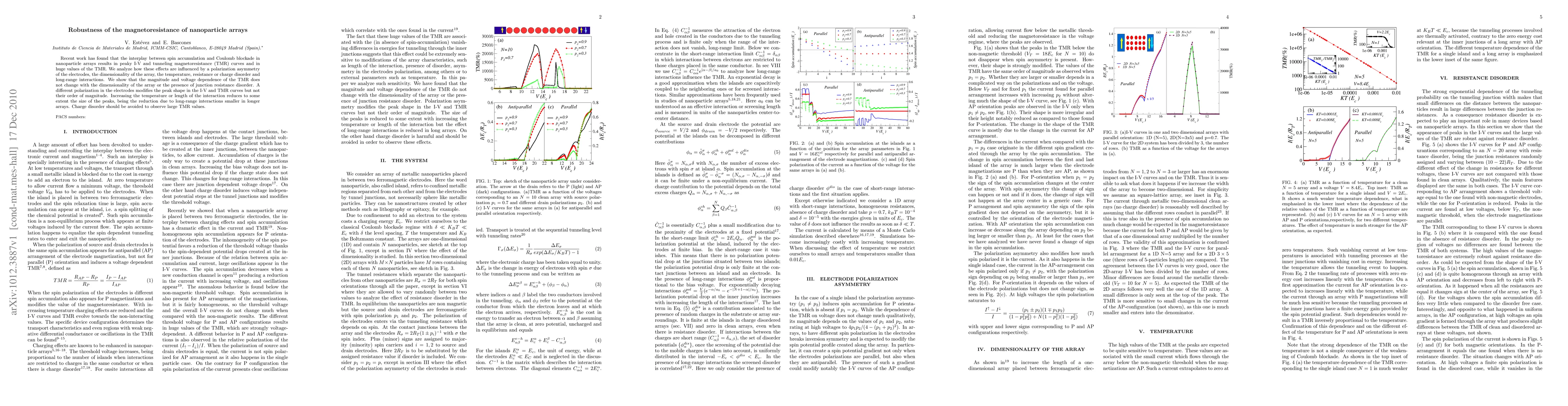 This paper investigates the robustness of tunneling magnetoresistance (TMR) in nanoparticle arrays, finding that TMR magnitude and voltage dependence remain stable across different dimensionalities and junction resistance disorder. While electrode polarization asymmetry alters peak shape, temperature and long-range interactions slightly reduce peak size, with longer arrays showing less reduction due to interactions.