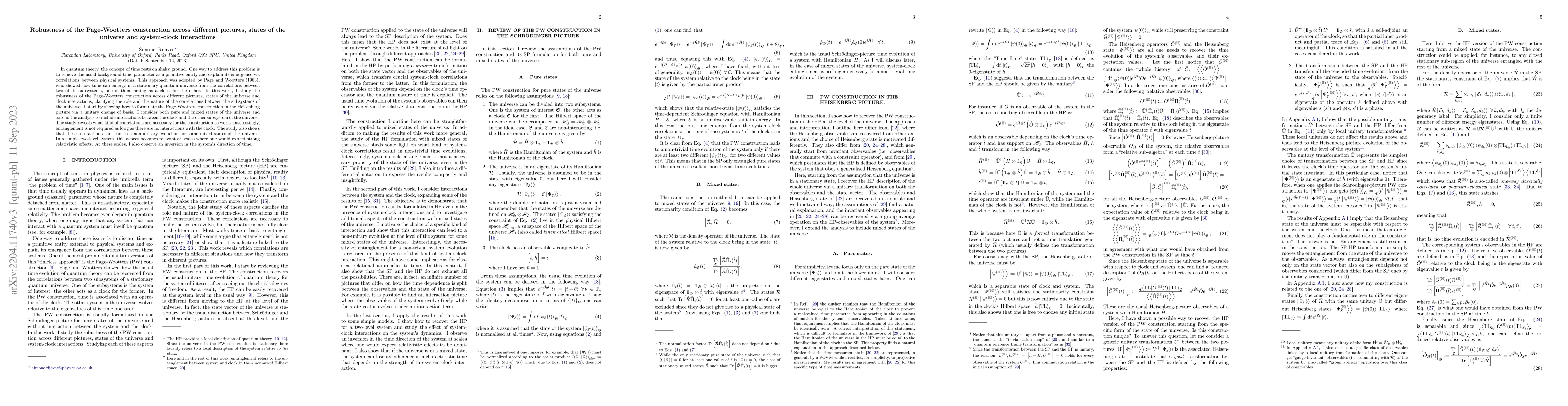 This paper investigates the robustness of the Page-Wootters construction, which explains the emergence of time from quantum correlations, across various quantum pictures and states. It finds that entanglement is not necessary for time emergence, but interactions with a clock can lead to non-unitary evolution and a reversal of time direction at relativistic scales.