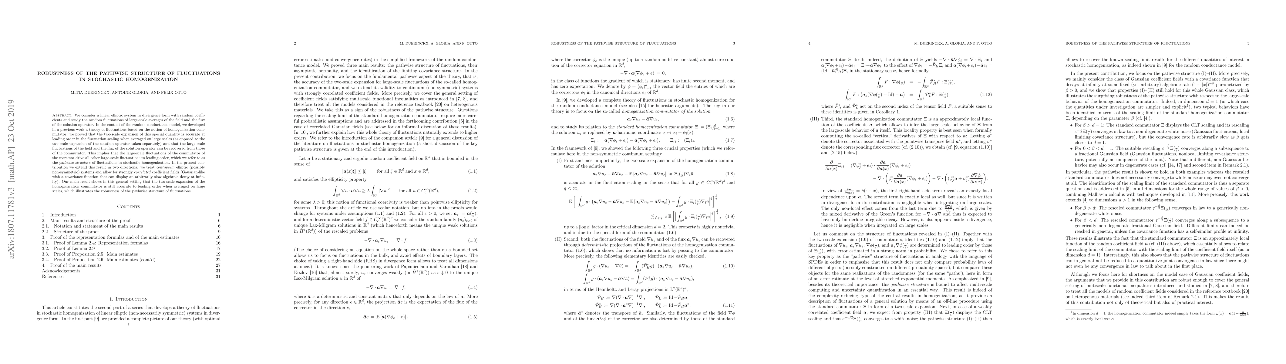 We consider a linear elliptic system in divergence form with random coefficients and study the random fluctuations of large-scale averages of the field and the flux of the solution operator. In the context of the random conductance model, we developed in a previous work a theory of fluctuations based on the notion of homogenization commutator: we proved that the two-scale expansion of this special quantity is accurate at leading order in the fluctuation scaling when averaged on large scales (as opposed to the two-scale expansion of the solution operator taken separately) and that the large-scale fluctuations of the field and the flux of the solution operator can be recovered from those of the commutator. This implies that the large-scale fluctuations of the commutator of the corrector drive all other large-scale fluctuations to leading order, which we refer to as the pathwise structure of fluctuations in stochastic homogenization. In the present contribution we extend this result in two directions: we treat continuum elliptic (possibly non-symmetric) systems and allow for strongly correlated coefficient fields (Gaussian-like with a covariance function that can display an arbitrarily slow algebraic decay at infinity). Our main result shows in this general setting that the two-scale expansion of the homogenization commutator is still accurate to leading order when averaged on large scales, which illustrates the robustness of the pathwise structure of fluctuations.