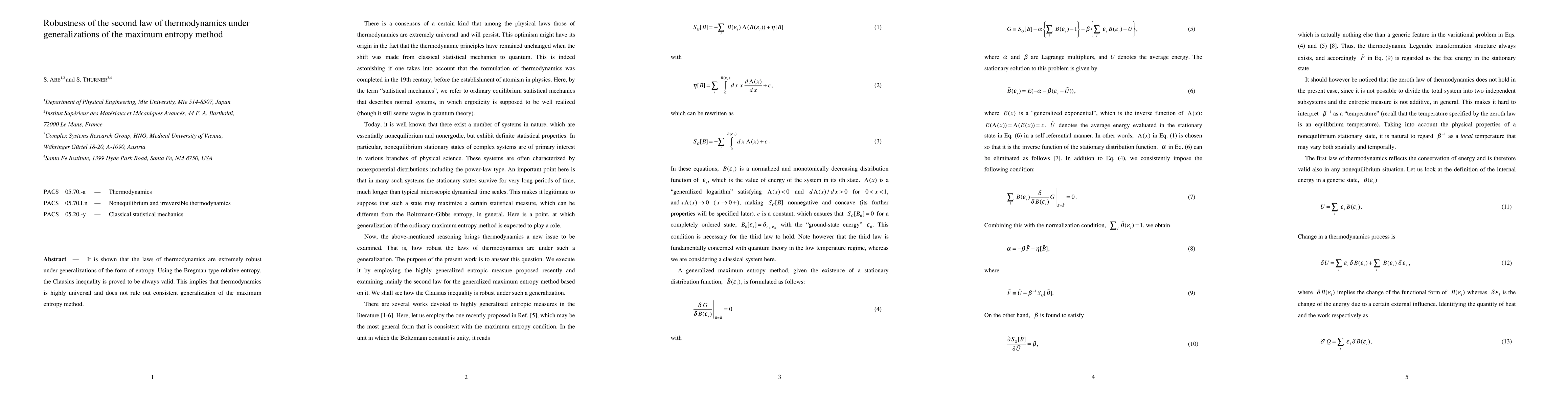 It is shown that the laws of thermodynamics are extremely robust under generalizations of the form of entropy. Using the Bregman-type relative entropy, the Clausius inequality is proved to be always valid. This implies that thermodynamics is highly universal and does not rule out consistent generalization of the maximum entropy method.