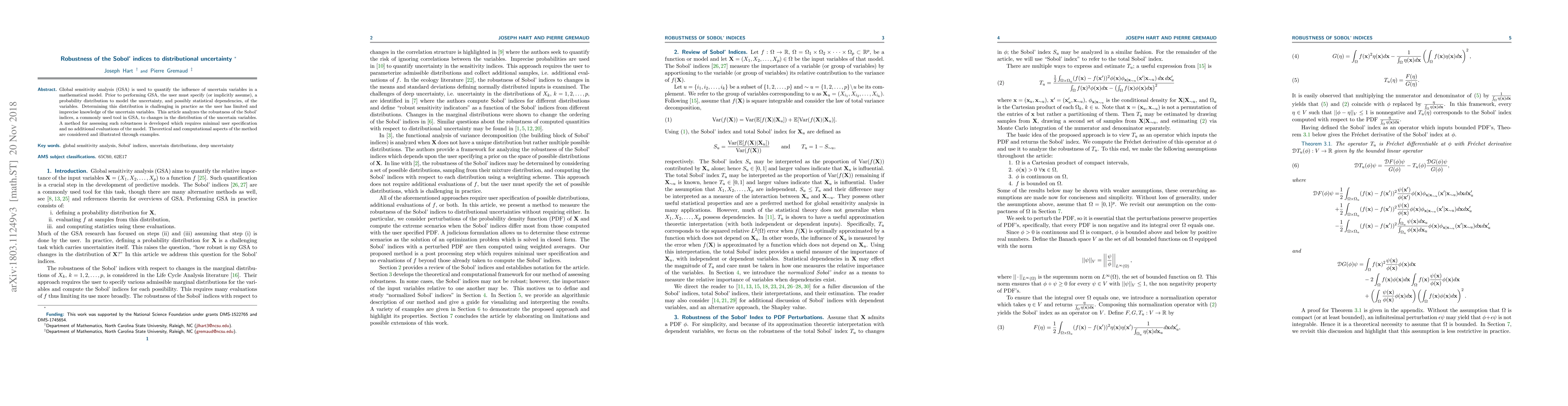 Global sensitivity analysis (GSA) is used to quantify the influence of uncertain variables in a mathematical model. Prior to performing GSA, the user must specify (or implicitly assume), a probability distribution to model the uncertainty, and possibly statistical dependencies, of the variables. Determining this distribution is challenging in practice as the user has limited and imprecise knowledge of the uncertain variables. This article analyzes the robustness of the Sobol' indices, a commonly used tool in GSA, to changes in the distribution of the uncertain variables. A method for assessing such robustness is developed which requires minimal user specification and no additional evaluations of the model. Theoretical and computational aspects of the method are considered and illustrated through examples.