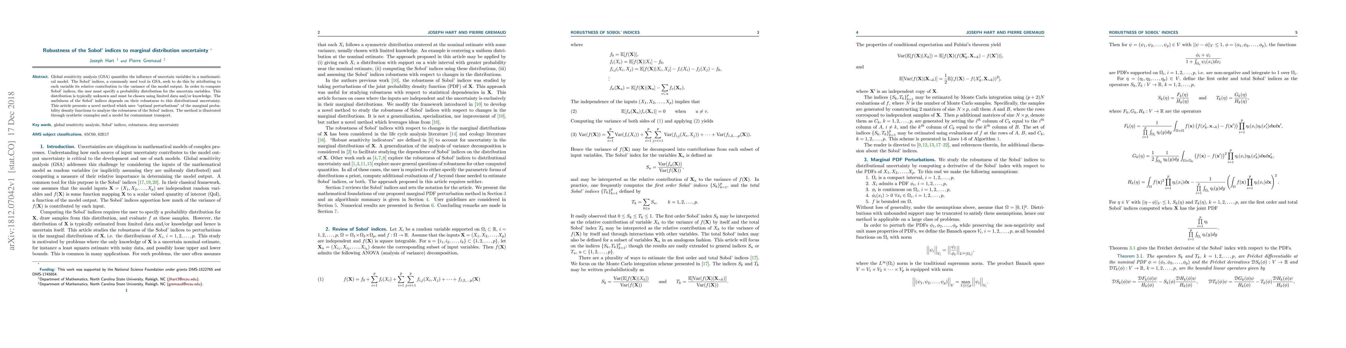 This paper investigates the robustness of Sobol' indices in global sensitivity analysis under uncertainty in the marginal distributions of input variables. It introduces a novel method using "optimal perturbations" to assess this robustness, demonstrated through synthetic examples and a contaminant transport model.