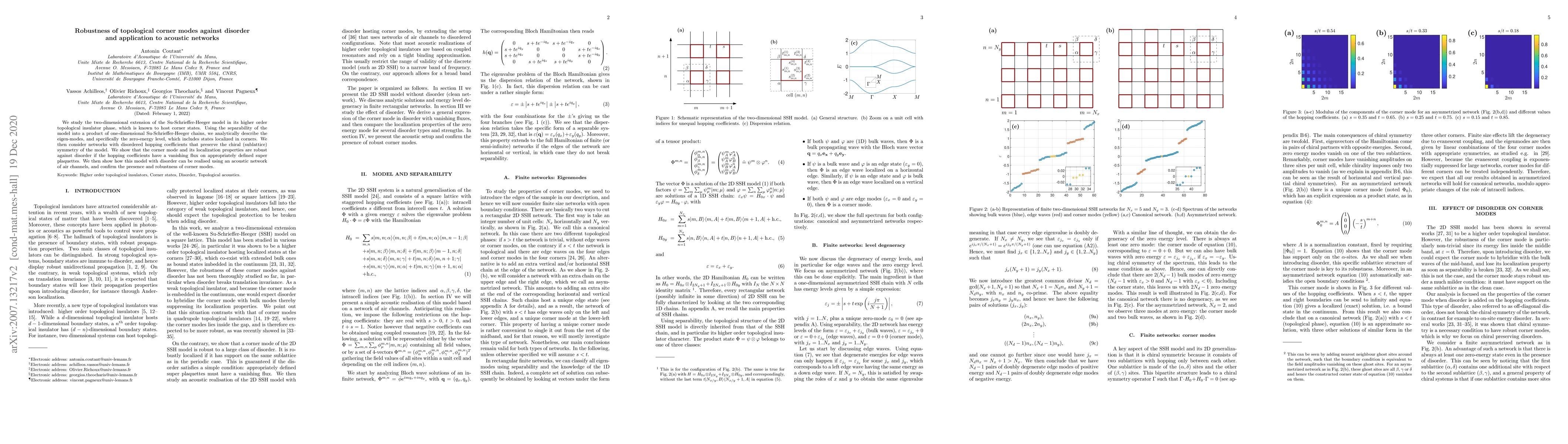 This paper investigates the robustness of topological corner modes in a two-dimensional extension of the Su-Schrieffer-Heeger model, demonstrating their stability against disorder while preserving chiral symmetry. It also applies this model to an acoustic network, confirming the presence and robustness of corner modes in a physical setup.