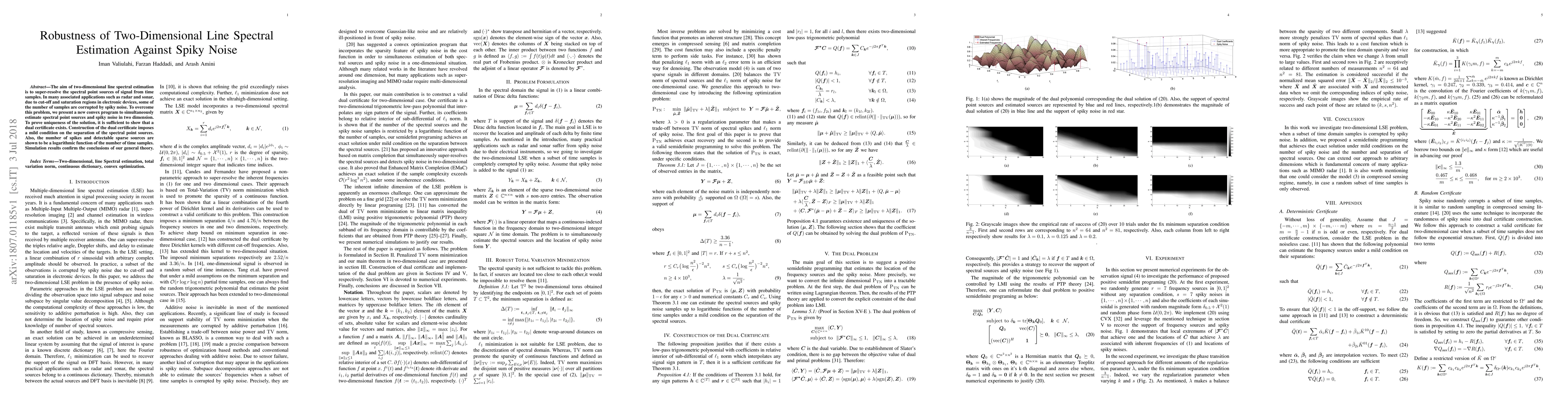 The aim of two-dimensional line spectral estimation is to super-resolve the spectral point sources of the signal from time samples. In many associated applications such as radar and sonar, due to cut-off and saturation regions in electronic devices, some of the numbers of samples are corrupted by spiky noise. To overcome this problem, we present a new convex program to simultaneously estimate spectral point sources and spiky noise in two dimensions. To prove uniqueness of the solution, it is sufficient to show that a dual certificate exists. Construction of the dual certificate imposes a mild condition on the separation of the spectral point sources. Also, the number of spikes and detectable sparse sources are shown to be a logarithmic function of the number of time samples. Simulation results confirm the conclusions of our general theory.