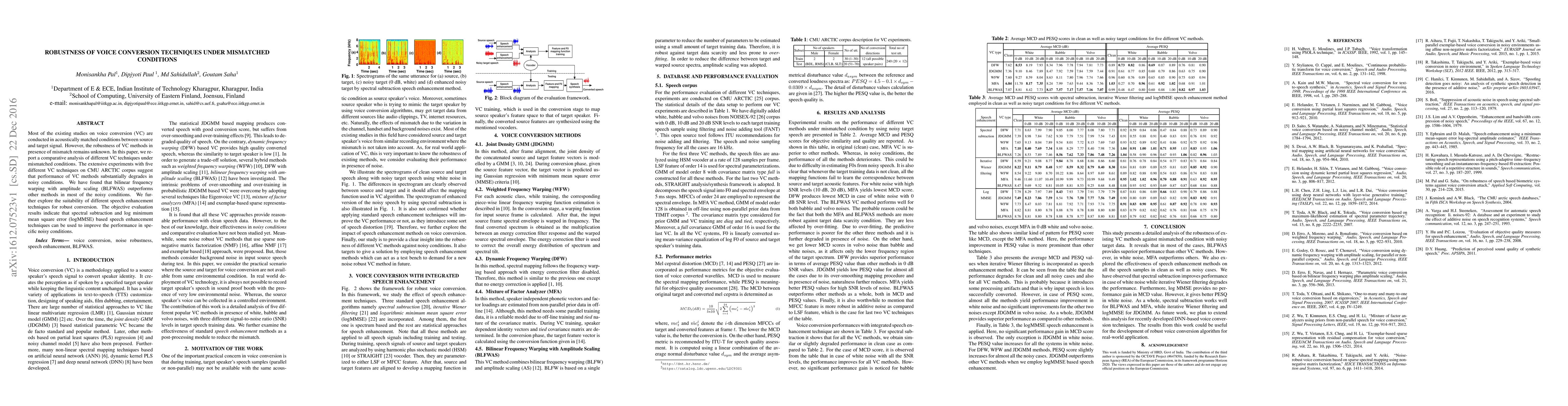 This paper investigates the robustness of various voice conversion techniques under mismatched conditions, finding that performance significantly declines in noisy environments. The study concludes that bilinear frequency warping with amplitude scaling (BLFWAS) is the most effective method, and spectral subtraction and logMMSE-based speech enhancement techniques can further improve performance in specific noisy scenarios.
