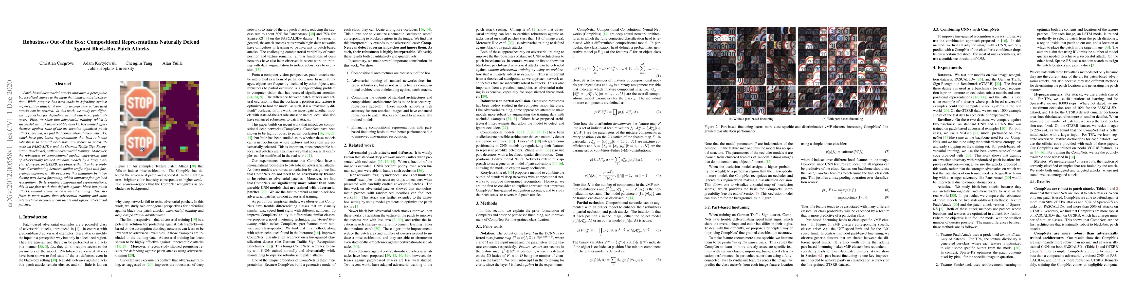This paper demonstrates that compositional deep networks, which naturally possess part-based representations, exhibit inherent robustness against black-box patch attacks without requiring adversarial training. It also introduces part-based finetuning to enhance fine-grained recognition, achieving superior performance compared to adversarially trained models.