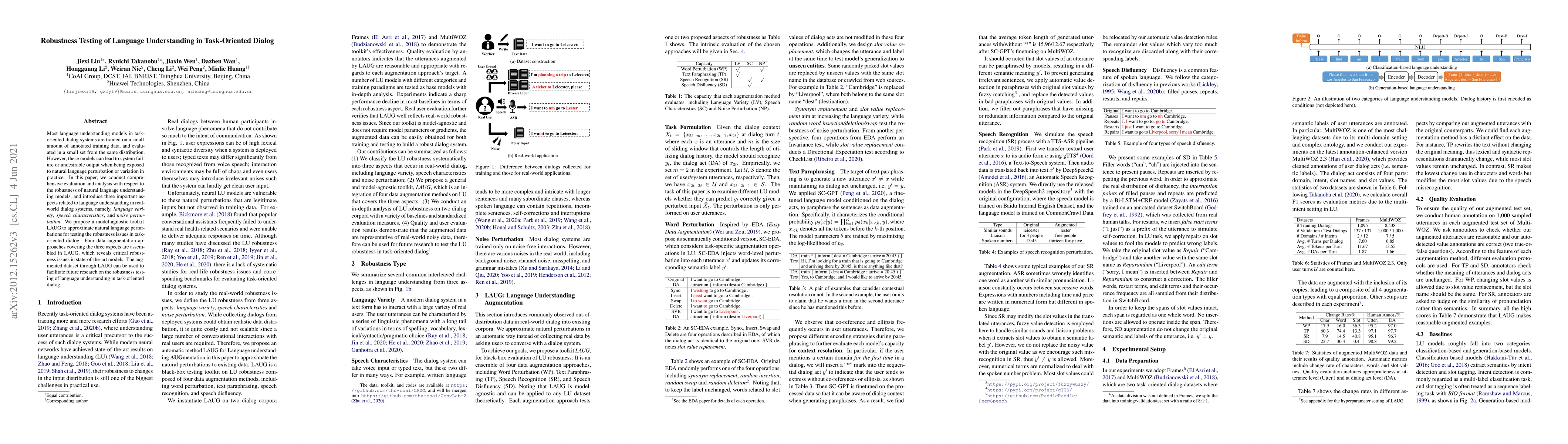 This paper evaluates the robustness of natural language understanding models in task-oriented dialog systems, focusing on language variety, speech characteristics, and noise. It introduces LAUG, a model-agnostic toolkit with four data augmentation approaches to simulate real-world perturbations, revealing significant robustness issues in current models and providing a dataset for future research.