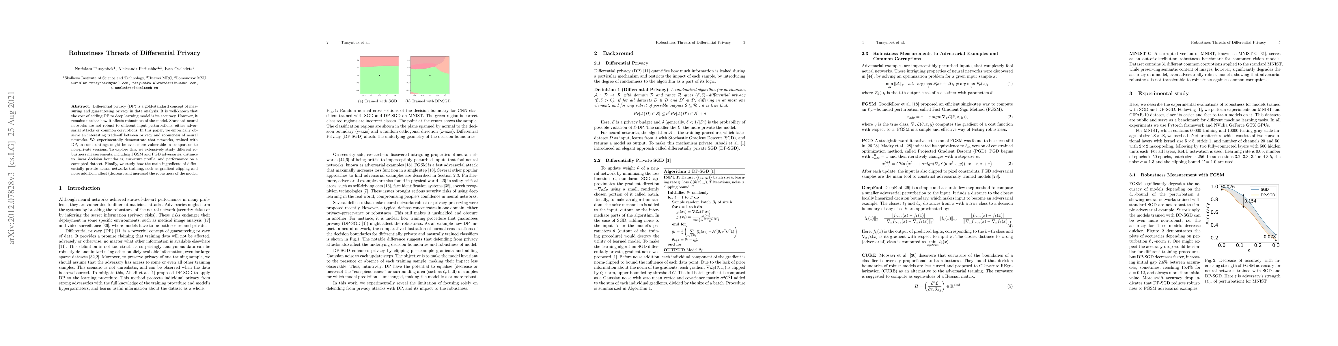 Differential privacy (DP) is a gold-standard concept of measuring and guaranteeing privacy in data analysis. It is well-known that the cost of adding DP to deep learning model is its accuracy. However, it remains unclear how it affects robustness of the model. Standard neural networks are not robust to different input perturbations: either adversarial attacks or common corruptions. In this paper, we empirically observe an interesting trade-off between privacy and robustness of neural networks. We experimentally demonstrate that networks, trained with DP, in some settings might be even more vulnerable in comparison to non-private versions. To explore this, we extensively study different robustness measurements, including FGSM and PGD adversaries, distance to linear decision boundaries, curvature profile, and performance on a corrupted dataset. Finally, we study how the main ingredients of differentially private neural networks training, such as gradient clipping and noise addition, affect (decrease and increase) the robustness of the model.