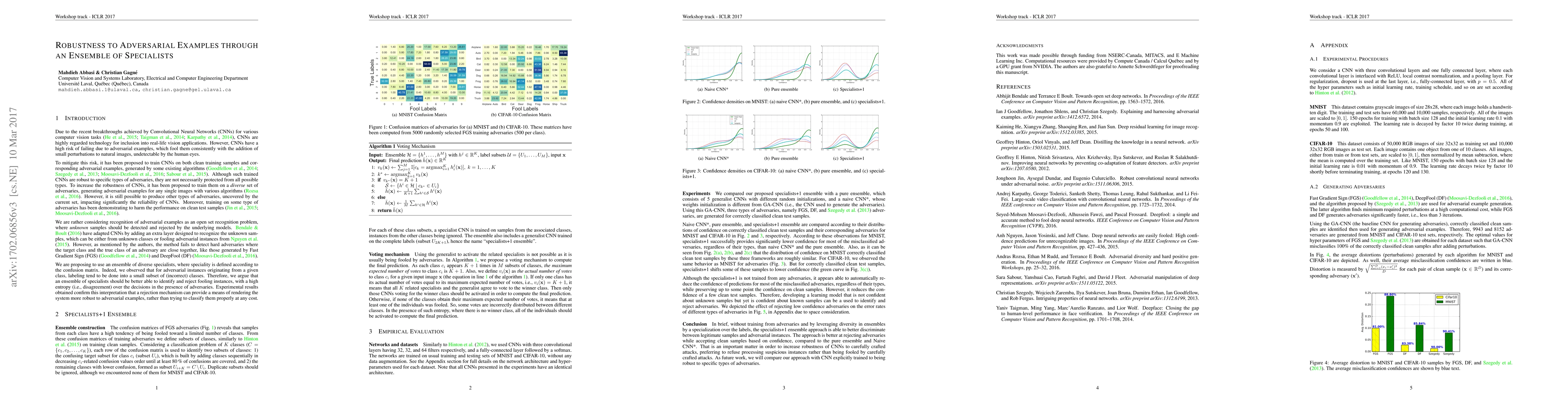This paper proposes using an ensemble of diverse specialists, each specialized according to the confusion matrix, to enhance robustness against adversarial examples. The ensemble aims to reject rather than misclassify adversarial instances, demonstrating improved robustness through high entropy disagreement among specialists.