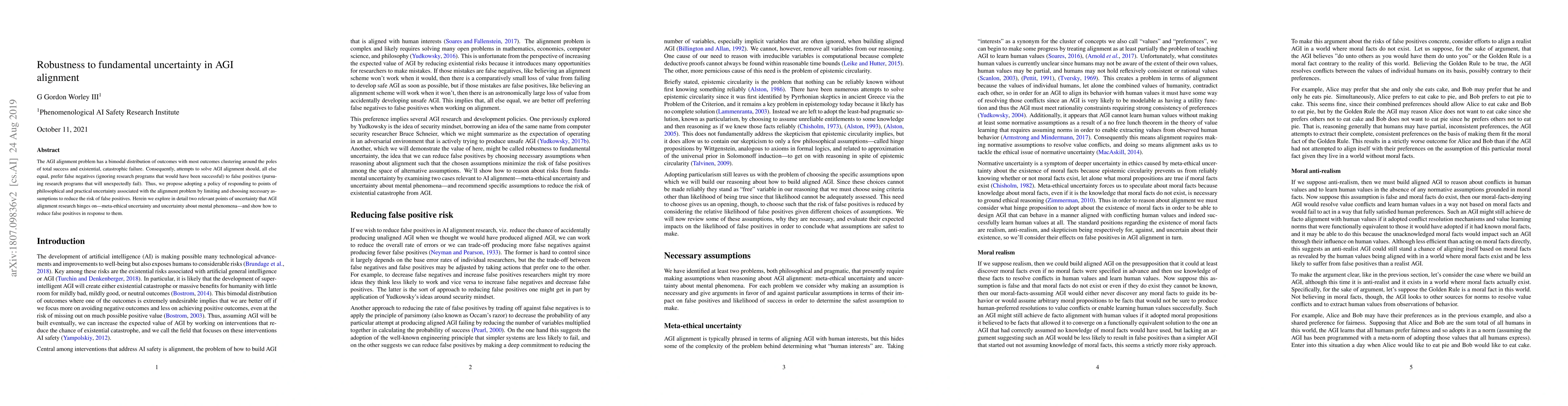 The AGI alignment problem has a bimodal distribution of outcomes with most outcomes clustering around the poles of total success and existential, catastrophic failure. Consequently, attempts to solve AGI alignment should, all else equal, prefer false negatives (ignoring research programs that would have been successful) to false positives (pursuing research programs that will unexpectedly fail). Thus, we propose adopting a policy of responding to points of philosophical and practical uncertainty associated with the alignment problem by limiting and choosing necessary assumptions to reduce the risk of false positives. Herein we explore in detail two relevant points of uncertainty that AGI alignment research hinges on---meta-ethical uncertainty and uncertainty about mental phenomena---and show how to reduce false positives in response to them.