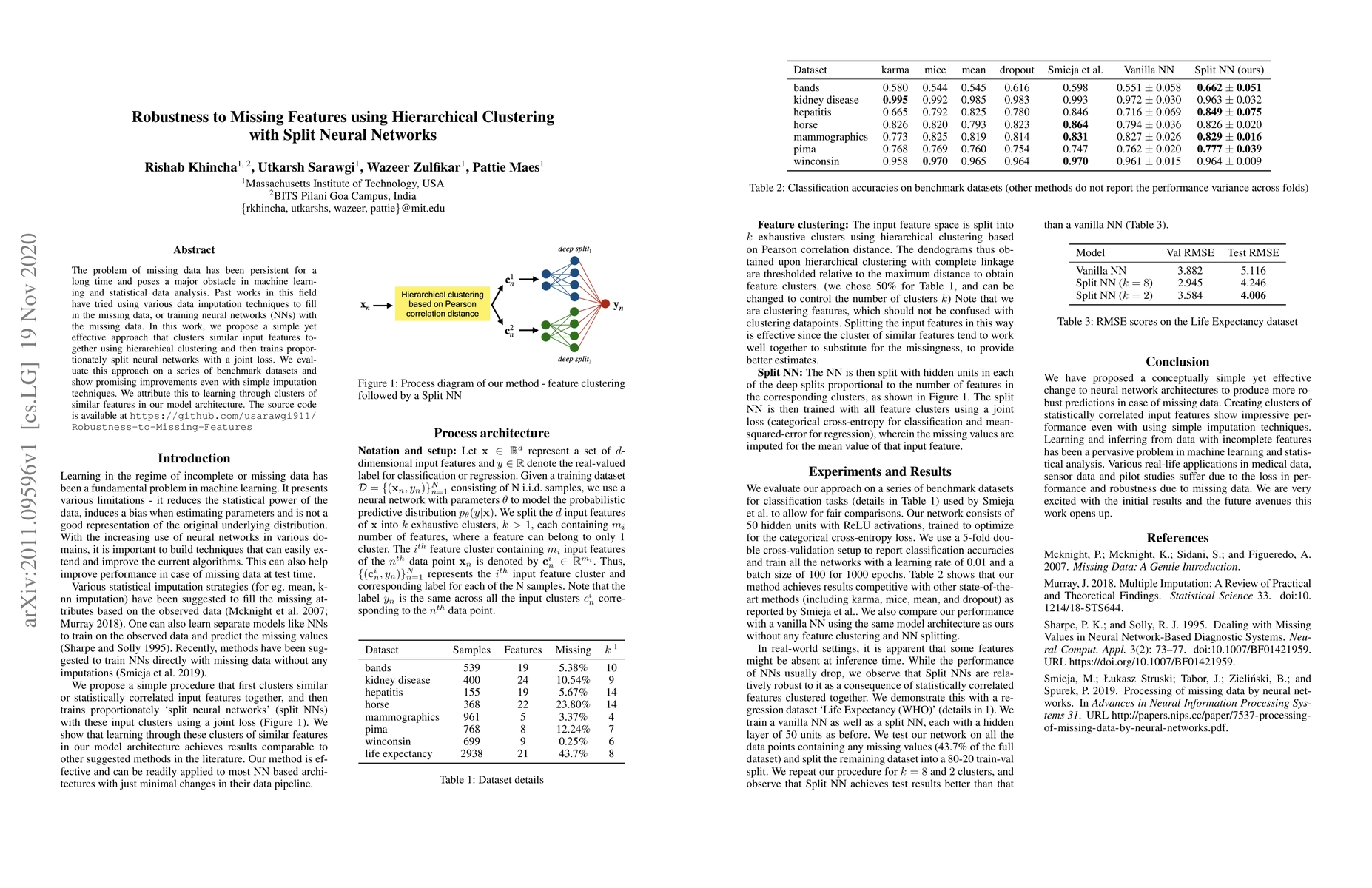 This paper proposes a robust method for handling missing data in machine learning by using hierarchical clustering to group similar features and training split neural networks with a joint loss function. The approach shows promising results on benchmark datasets, demonstrating the effectiveness of learning through clustered feature groups.