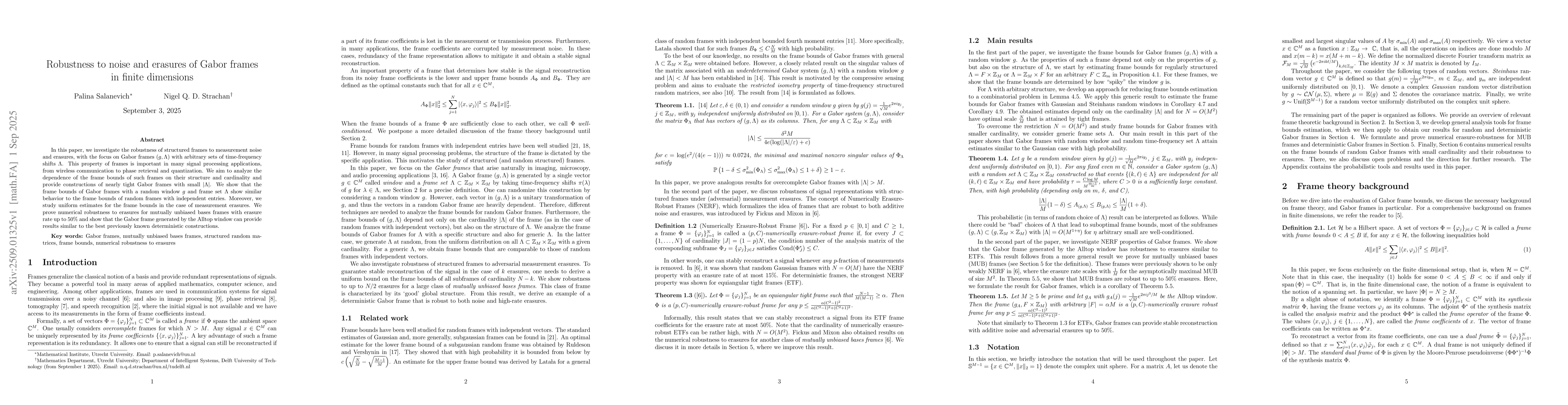 In this paper, we investigate the robustness of structured frames to measurement noise and erasures, with the focus on Gabor frames $(g, \Lambda)$ with arbitrary sets of time-frequency shifts $\Lambda$. This property of frames is important in many signal processing applications, from wireless communication to phase retrieval and quantization. We aim to analyze the dependence of the frame bounds of such frames on their structure and cardinality and provide constructions of nearly tight Gabor frames with small $\vert \Lambda \vert$. We show that the frame bounds of Gabor frames with a random window $g$ and frame set $\Lambda$ show similar behavior to the frame bounds of random frames with independent entries. Moreover, we study uniform estimates for the frame bounds in the case of measurement erasures. We prove numerical robustness to erasures for mutually unbiased bases frames with erasure rate up to 50\% and show that the Gabor frame generated by the Alltop window can provide results similar to the best previously known deterministic constructions.