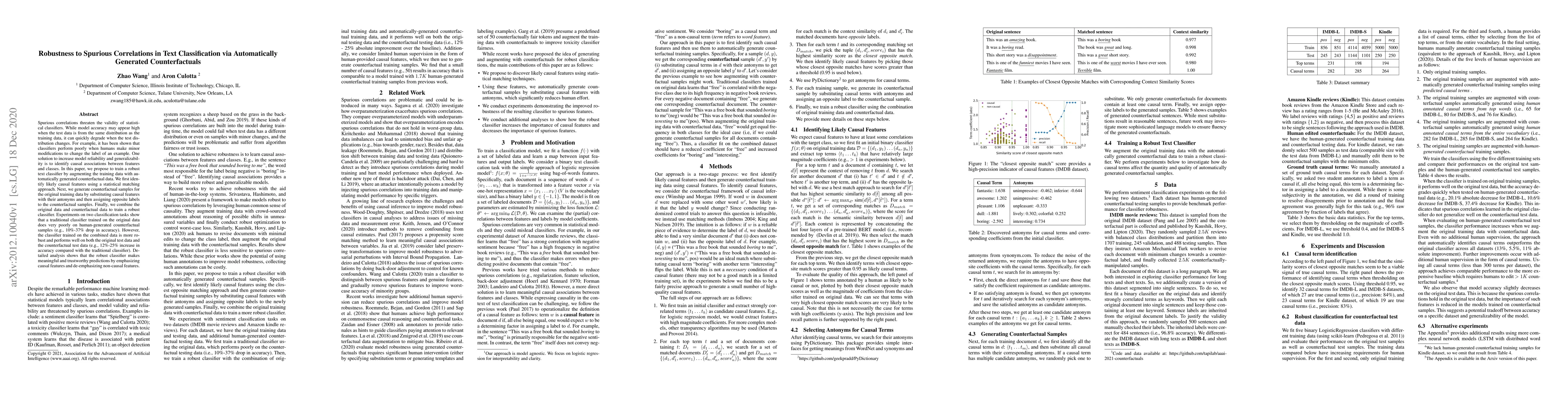 Spurious correlations threaten the validity of statistical classifiers. While model accuracy may appear high when the test data is from the same distribution as the training data, it can quickly degrade when the test distribution changes. For example, it has been shown that classifiers perform poorly when humans make minor modifications to change the label of an example. One solution to increase model reliability and generalizability is to identify causal associations between features and classes. In this paper, we propose to train a robust text classifier by augmenting the training data with automatically generated counterfactual data. We first identify likely causal features using a statistical matching approach. Next, we generate counterfactual samples for the original training data by substituting causal features with their antonyms and then assigning opposite labels to the counterfactual samples. Finally, we combine the original data and counterfactual data to train a robust classifier. Experiments on two classification tasks show that a traditional classifier trained on the original data does very poorly on human-generated counterfactual samples (e.g., 10%-37% drop in accuracy). However, the classifier trained on the combined data is more robust and performs well on both the original test data and the counterfactual test data (e.g., 12%-25% increase in accuracy compared with the traditional classifier). Detailed analysis shows that the robust classifier makes meaningful and trustworthy predictions by emphasizing causal features and de-emphasizing non-causal features.